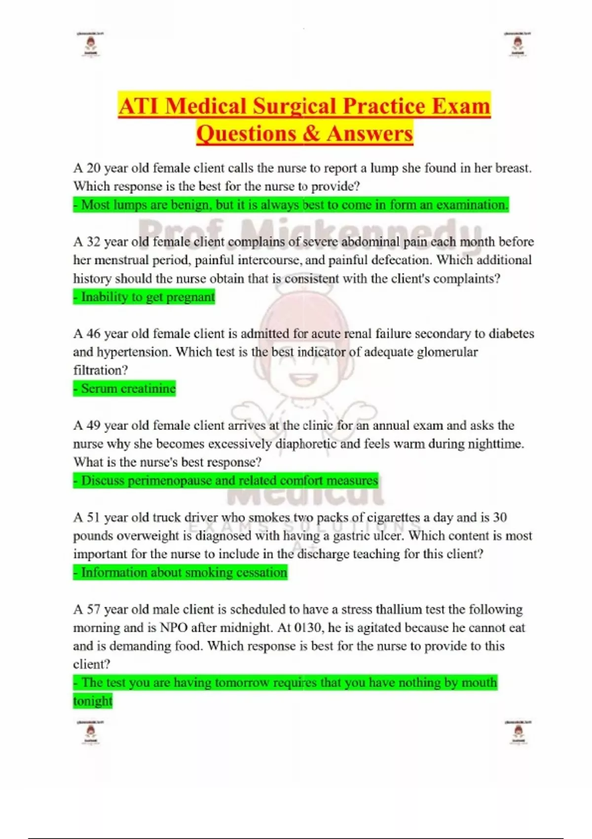 ATI Medical Surgical Practice Exam Questions & Answers-A 20 year old female client calls the nurse to report a lump she found in her breast. Which response is the best for the nurse to provide? - Most lumps are benign, but it is always best to come in form an examination. A 32 year old female client complains of severe abdominal pain each month before her menstrual period, painful intercourse, and painful defecation. Which additional history should the nurse obtain that is consistent with the client's complaints? - Inability to get pregnant A 46 year old female client is admitted for acute renal failure secondary to diabetes and hypertension. Which test is the best indicator of adequate glomerular filtration? - Serum creatinine A 49 year old female client arrives at the clinic for an annual exam and asks the nurse why she becomes excessively diaphoretic and feels warm during nighttime. What is the nurse's best response? - Discuss perimenopause and related comfort measures A 51 year old truck driver who smokes two packs of cigarettes a day and is 30 pounds overweight is diagnosed with having a gastric ulcer. Which content is most important for the nurse to include in the discharge teaching for this client? - Information about smoking cessation A 57 year old male client is scheduled to have a stress thallium test the following morning and is NPO after midnight. At 0130, he is agitated because he cannot eat and is demanding food. Which response is best for the nurse to provide to this client? - The test you are having tomorrow requires that you have nothing by mouth tonight A 58 year old client who has been post menopausal for five years is concerned about the risk of osteoporosis because her mother has the condition. Which information should the nurse offer? - Calcium loss from bones can be slowed by increasing calcium intake and exercise A 58 year old client, who has no health problems, asks the nurse about the Pneumovax vaccine. The nurse's response to the client should be based on which information? - The immunization is administered once to older adults or persons with a history of chronic illness A 67 year old woman who lives alone tripped on a rug in her home and fractured her hip. Which predisposing factor probably led to the fracture in the proximal end of her femur? - Osteoporosis resulting from hormonal changes A 77 year old female client is admitted to the hospital. She is confused, has no appetite, is nauseated and vomiting, and is complaining of a headache. Her pulse rate is 43 beats per minute. It is most important for the nurse to assess for which finding? - Takes digitalis A client experiencing uncontrolled atrial fibrillation is admitted to the telemetry unit. What initial medication should the nurse anticipate administering to the client? - Digoxin A client has a staging procedure for cancer of the breast and ask the nurse which type of breast cancer has the poorest prognosis. Which information should the nurse offer the client? - Inflammatory with peau d'orange A client has been hospitalized with a femur fracture and is being treated with traction. which action by the nurse is the priority when caring for this client? - Assess neurovascular status A client has been taking oral corticosteroids for the past five days because of seasonal allergies. Which assessment finding is of most concern to the nurse? - Purulent sputum