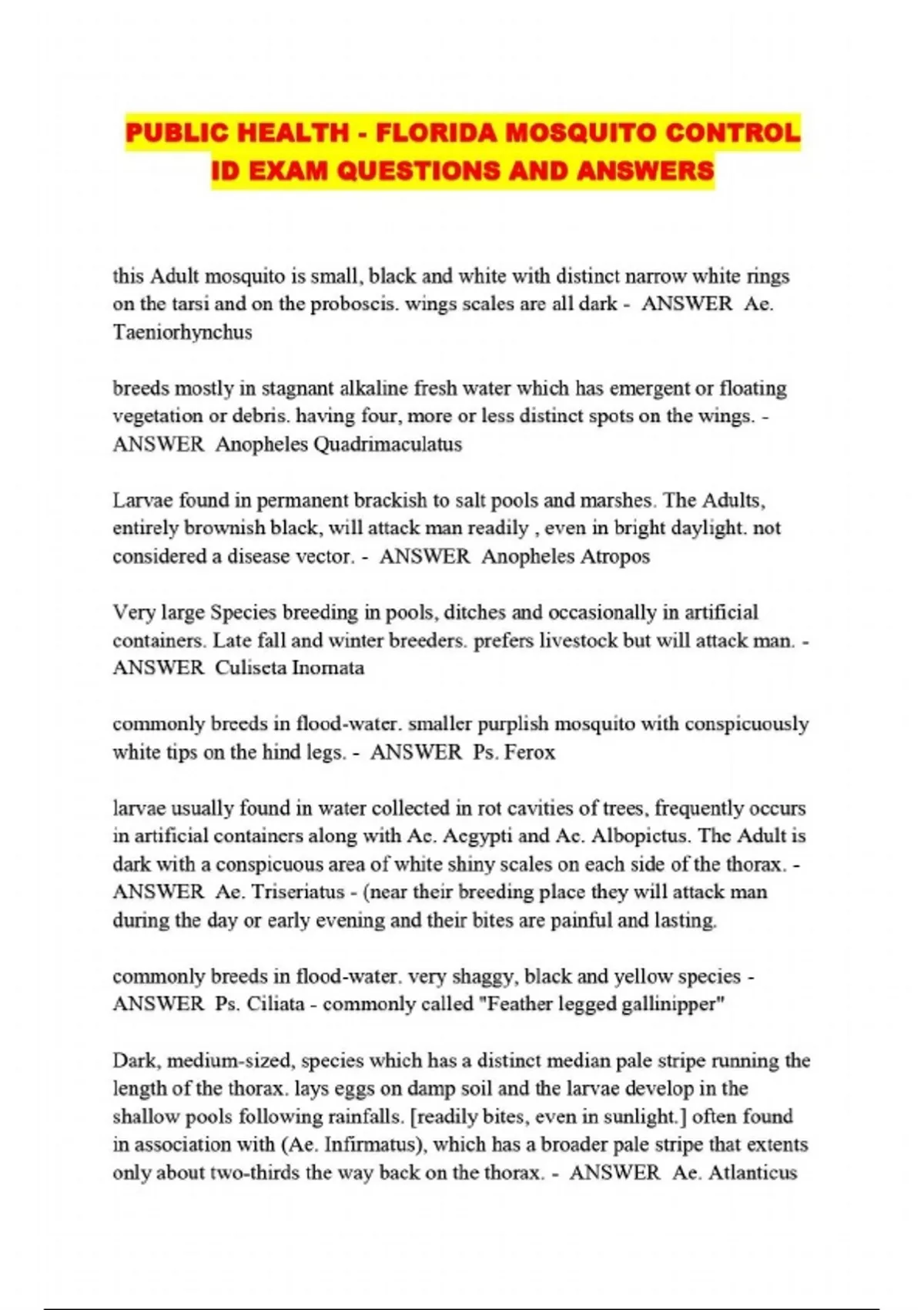 PUBLIC HEALTH - FLORIDA MOSQUITO CONTROL ID EXAM QUESTIONS AND ANSWERS....