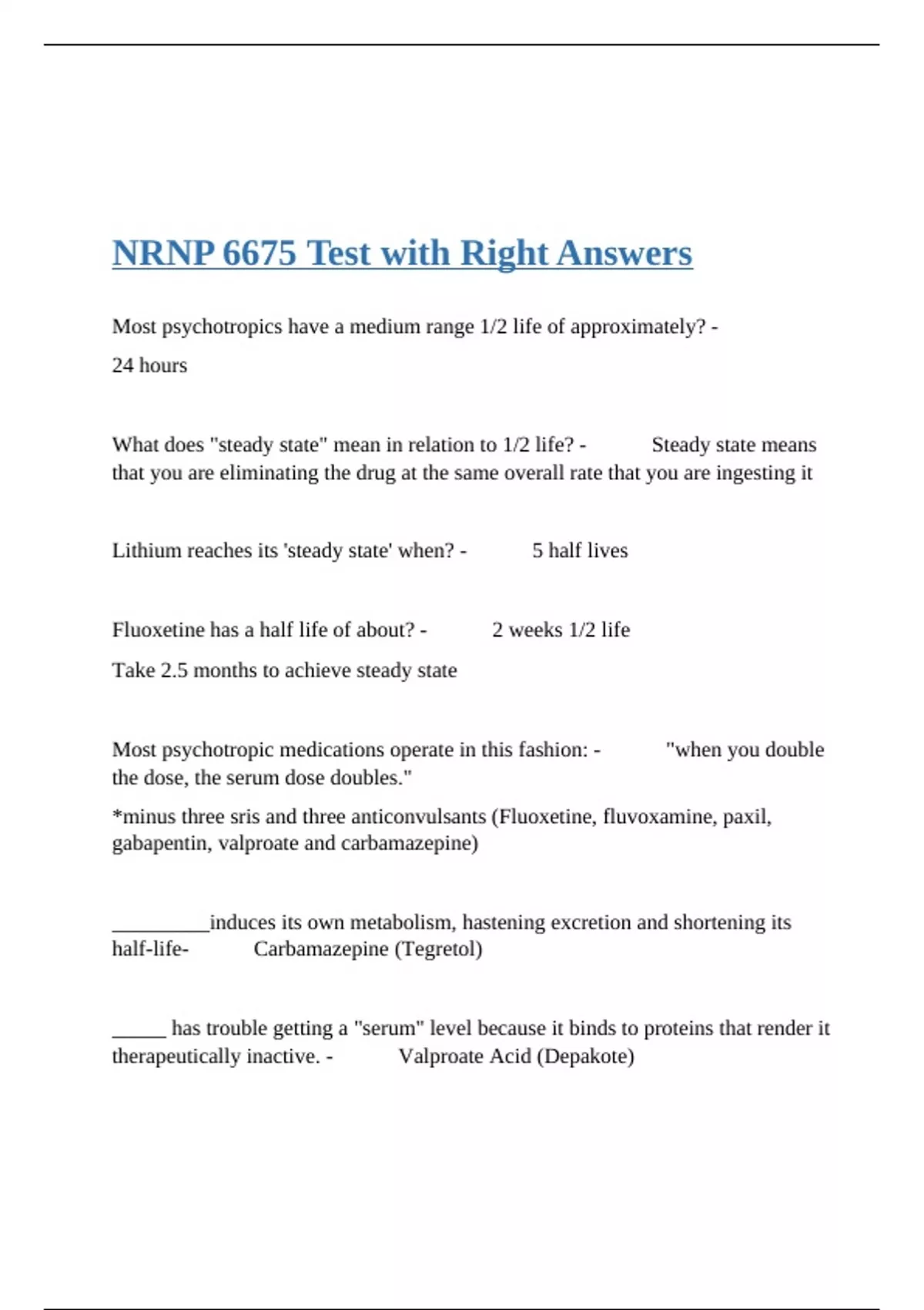 Most psychotropics have a medium range 1/2 life of approximately? - 24 hours What does "steady state" mean in relation to 1/2 life? - Steady state means that you are eliminating the drug at the same overall rate that you are ingesting it Lithium reaches its 'steady state' when? - 5 half lives Fluoxetine has a half life of about? - 2 weeks 1/2 life Take 2.5 months to achieve steady state Most psychotropic medications operate in this fashion: - "when you double the dose, the serum dose doubles." *minus three sris and three anticonvulsants (Fluoxetine, fluvoxamine, paxil, gabapentin, valproate and carbamazepine) _________induces its own metabolism, hastening excretion and shortening its half-life- Carbamazepine (Tegretol) _____ has trouble getting a "serum" level because it binds to proteins that render it therapeutically inactive. - Valproate Acid (Depakote) _______'s serum level is the opposite of Valproic Acid: it rises quickly at first and then slows down. - Gabapentin Gabapentin saturates the transporters that absorb it in the small intestine, causing its levels to rise at a slow pace when the dosage goes above a certain saturation point which is around 900 mg/day.