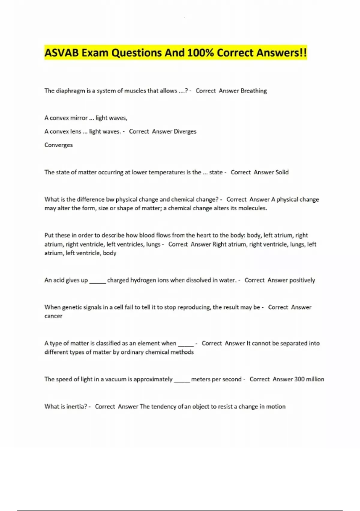 ASVAB Exam Questions And 100% Correct Answers!! The diaphragm is a system of muscles that allows ....? - Correct Answer Breathing A convex mirror ... light waves, A convex lens ... light waves. - Correct Answer Diverges Converges The state of matter occurring at lower temperatures is the ... state - Correct Answer Solid What is the difference bw physical change and chemical change? - Correct Answer A physical change may alter the form, size or shape of matter; a chemical change alters its molecules. Put these in order to describe how blood flows from the heart to the body: body, left atrium, right atrium, right ventricle, left ventricles, lungs - Correct Answer Right atrium, right ventricle, lungs, left atrium, left ventricle, body An acid gives up _____ charged hydrogen ions when dissolved in water. - Correct Answer positively When genetic signals in a cell fail to tell it to stop reproducing, the result may be - Correct Answer cancer A type of matter is classified as an element when _____ - Correct Answer It cannot be separated into different types of matter by ordinary chemical methods The speed of light in a vacuum is approximately _____ meters per second - Correct Answer 300 million What is inertia? - Correct Answer The tendency of an object to resist a change in motion What is a vector quantity? - Correct Answer a quantity defined by both magnitude and direction What formula is used to calculate velocity - Correct Answer v = d/t, where v = velocity (a vector quantity), d = displacement (a vector quantity), and t = time Which two bodily functions are enhanced by calcium? - Correct Answer bone growth, muscle function The Moon affects which activity on Earth? - Correct Answer tides The asteroid belt closest to the Earth lies between which two planets? - Correct Answer Mars and Jupiter