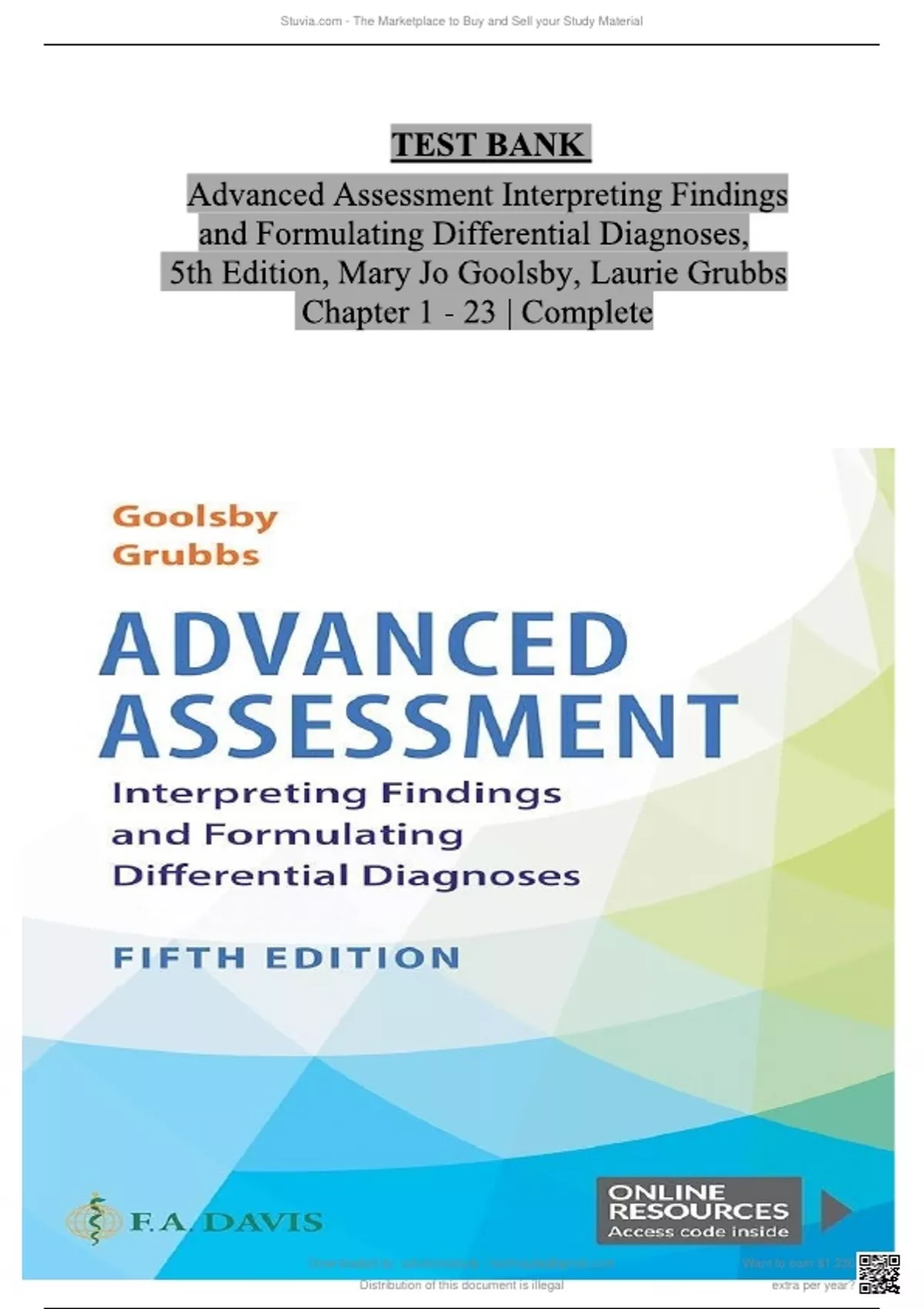 TEST BANK FOR ADVANCED ASSESSMENT INTERPRETING FINDINGS AND FORMULATING DIFFERENTIAL DIAGNOSES 5th Edition, Mary Jo Goolsby, Laurie Grubbs. A+ Graded.