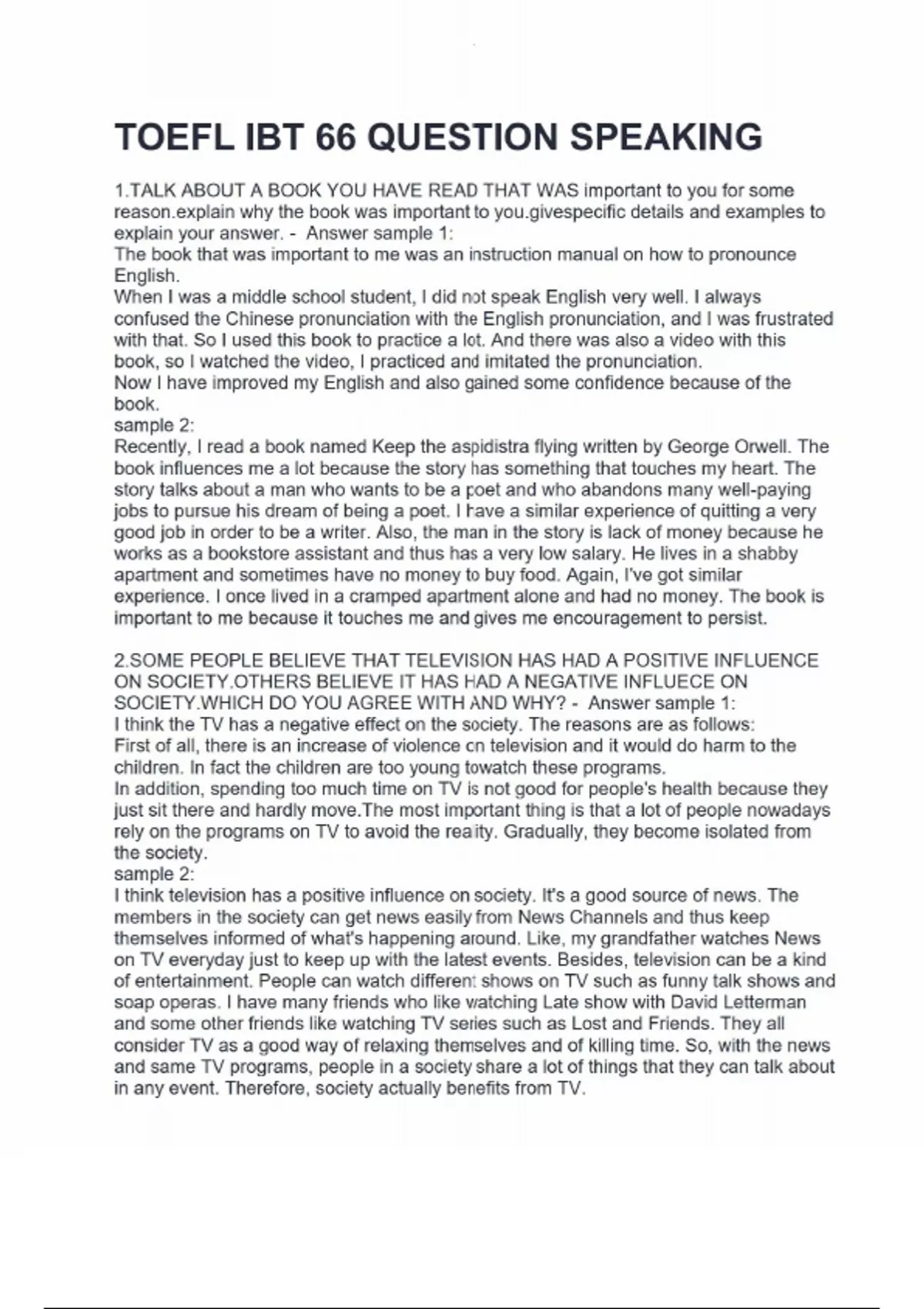 TOEFL IBT 66 QUESTION SPEAKING 1.TALK ABOUT A BOOK YOU HAVE READ THAT WAS important to you for some in why the book was important to pecific details and examples to explain your answer. - Answer sample 1: The book that was important to me was an instruction manual on how to pronounce English. When I was a middle school student, I did not speak English very well. I always confused the Chinese pronunciation with the English pronunciation, and I was frustrated with that. So I used this book to practice a lot. And there was also a video with this book, so I watched the video, I practiced and imitated the pronunciation. Now I have improved my English and also gained some confidence because of the book. sample 2: Recently, I read a book named Keep the aspidistra flying written by George Orwell. The book influences me a lot because the story has something that touches my heart. The story talks about a man who wants to be a poet and who abandons many well-paying jobs to pursue his dream of being a poet. I have a similar experience of quitting a very good job in order to be a writer. Also, the man in the story is lack of money because he works as a bookstore assistant and thus has a very low salary. He lives in a shabby apartment and sometimes have no money to buy food. Again, I've got similar experience. I once lived in a cramped apartment alone and had no money. The book is important to me because it touches me and gives me encouragement to persist. 2.SOME PEOPLE BELIEVE THAT TELEVISION HAS HAD A POSITIVE INFLUENCE ON SOCIETY.OTHERS BELIEVE IT HAS HAD A NEGATIVE INFLUECE ON SOCIETY.WHICH DO YOU AGREE WITH AND WHY? - Answer sample 1: I think the TV has a negative effect on the society. The reasons are as follows: First of all, there is an increase of violence on television and it would do harm to the children. In fact the children are too young towatch these programs. In addition, spending too much time on TV is not good for people's health because they just sit there and hardly move.The most important thing is that a lot of people nowadays rely on the programs on TV to avoid the reality. Gradually, they become isolated from the society. sample 2: I think television has a positive influence on society. It's a good source of news. The members in the society can get news easily from News Channels and thus keep themselves informed of what's happening around. Like, my grandfather watches News on TV everyday just to keep up with the latest events. Besides, television can be a kind of entertainment. People can watch different shows on TV such as funny talk shows and soap operas. I have many friends who like watching Late show with David Letterman and some other friends like watching TV series such as Lost and Friends. They all consider TV as a good way of relaxing themselves and of killing time. So, with the news and same TV programs, people in a society share a lot of things that they can talk about in any event. Therefore, society actually benefits from TV.