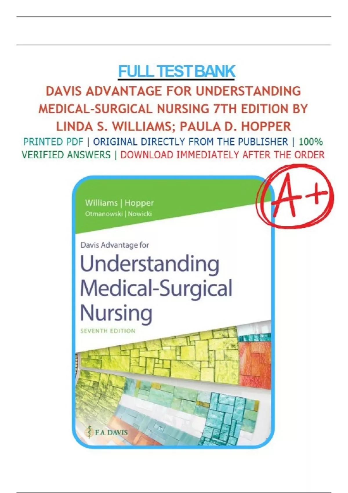 Test Bank for Davis Advantage for Understanding Medical-Surgical Nursing, 7th Edition, by Linda S. Williams, Paula D. Hopper. | 9781719649193 |All Chapters (1-57) LATEST