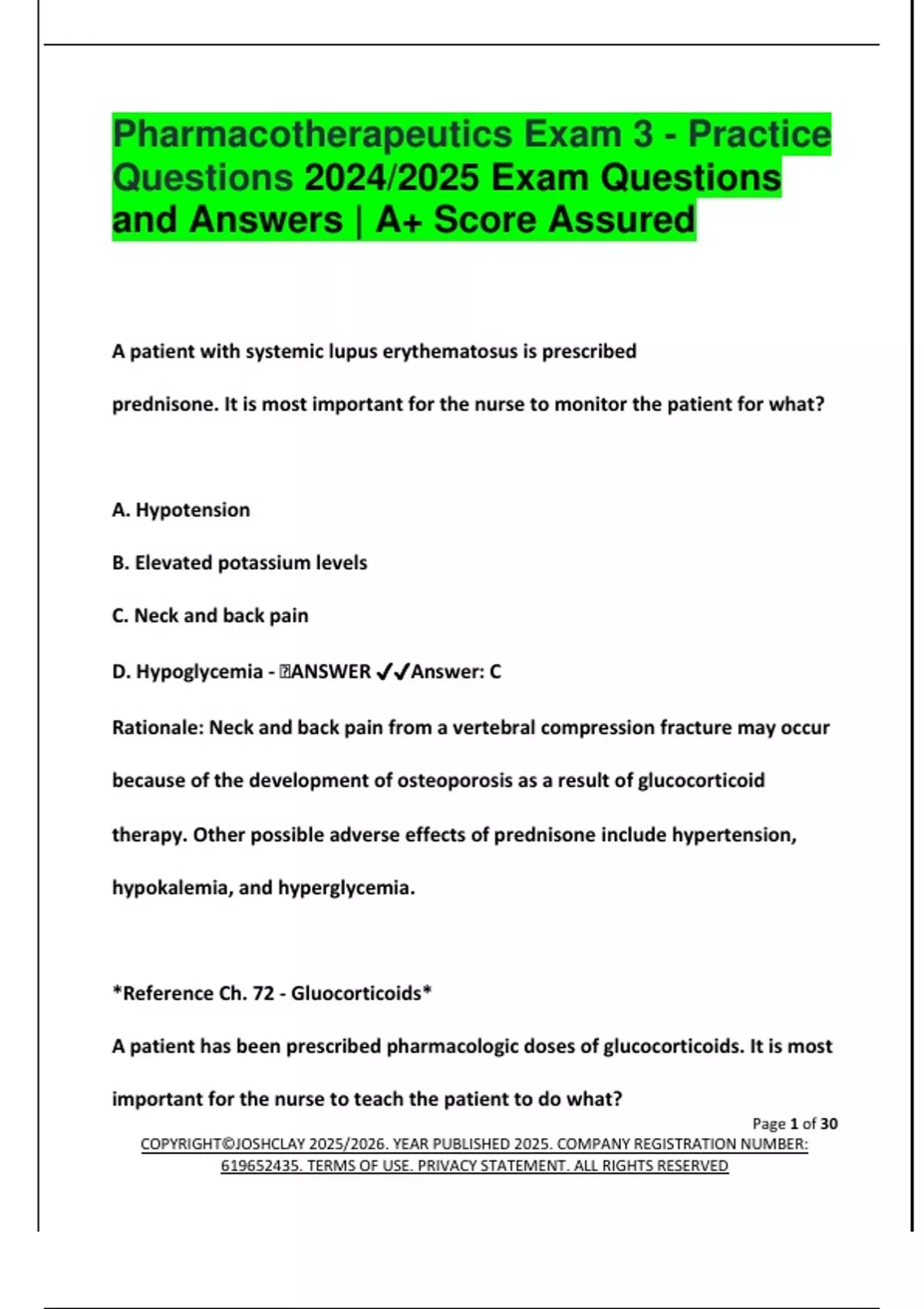 Pharmacotherapeutics Exam 3 - Practice Questions 2024/2025 Exam Questions and Answers | A+ Score Assured A patient with systemic lupus erythematosus is prescribed prednisone. It is most important for the nurse to monitor the patient for what? A. Hypotension B. Elevated potassium levels C. Neck and back pain D. Hypoglycemia -