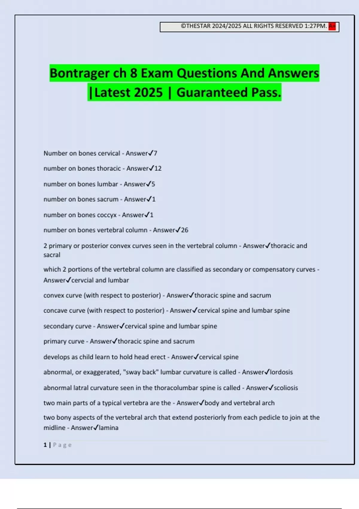 ©THESTAR 2024/2025 ALL RIGHTS RESERVED 1:27PM. A+ 1 | P a g e Bontrager ch 8 Exam Questions And Answers |Latest 2025 | Guaranteed Pass. Number on bones cervical - Answer7 number on bones thoracic - Answer12 number on bones lumbar - Answer5 number on bones sacrum - Answer1 number on bones coccyx - Answer1 number on bones vertebral column - Answer26 2 primary or posterior convex curves seen in the vertebral column - Answerthoracic and sacral which 2 portions of the vertebral column are classified as secondary or compensatory curves - Answercervcial and lumbar convex curve (with respect to posterior) - Answerthoracic spine and sacrum concave curve (with respect to posterior) - Answercervical spine and lumbar spine secondary curve - Answercervical spine and lumbar spine primary curve - Answerthoracic spine and sacrum develops as child learn to hold head erect - Answercervical spine abnormal, or exaggerated, "sway back" lumbar curvature is called - Answerlordosis abnormal latral curvature seen in the thoracolumbar spine is called - Answerscoliosis two main parts of a typical vertebra are the - Answerbody and vertebral arch two bony aspects of the vertebral arch that extend posteriorly from each pedicle to join at the midline - Answerlamina ©THESTAR 2024/2025 ALL RIGHTS RESERVED 1:27PM. A+ 2 | P a g e foramina are created by two small notches on the superior and inferior aspects of the pedicle - Answerintervertebral the opening, or passageway, for the spinal cord is - Answervertebral (spinal) canal the spinal cord begins with the ____ of the brain and extends down to the _____ vertebra, where it tapers and ends. this tapered ending is called ____ - Answermedulla oblongata, lower border of L1, and conus medullaris structures that pass through the intervertebral foramina - Answerspinal nerves and blood vessels the following is found between the superior and inferior articular processes - Answerzygapophyseal joints only T1,T11, and T12 have full facets for articulation with ribs. - Answertrue the zygapophyseal joints of all cervical vertebrae are visualized only in a true lateral pos. - Answerfalse ( between C1-C2 visualized on frontal or AP proj. ) outer and inner asepcts of the intervertebral disk - Answerannulus fibrosus and nucleus pulposus condition involving a "slipped disk" is correctly referred to as - Answerherniated nucleus pulposus (HNP) alternative names for C1 - Answeratlas alternative names for C2 - Answeraxis alternative names for C7 - Answervertebra prominens 3 features that make the cervical vertebrae unique - Answertransverse foramina, bifid spinous process, and overlapping vertebral bodies short column of bone found between the superior and articular processes in a typical cervical vertebra - Answerarticular pillar what is the term for the same structure, identified in the previous ques. for the C1 vertebra (articular pillar) - Answerlateral mass the zygapophyseal joints for the second through seventh cervical vertebrae are at a ____ angle to the midsagittal plane; the thoracic vertebrae are at a ____ to the midsagittal plane. - Answer90 degree and 70-75 degree what is the name of the joint found between the superior articular processes of C1 and the occipital condyles of the skull - Ans