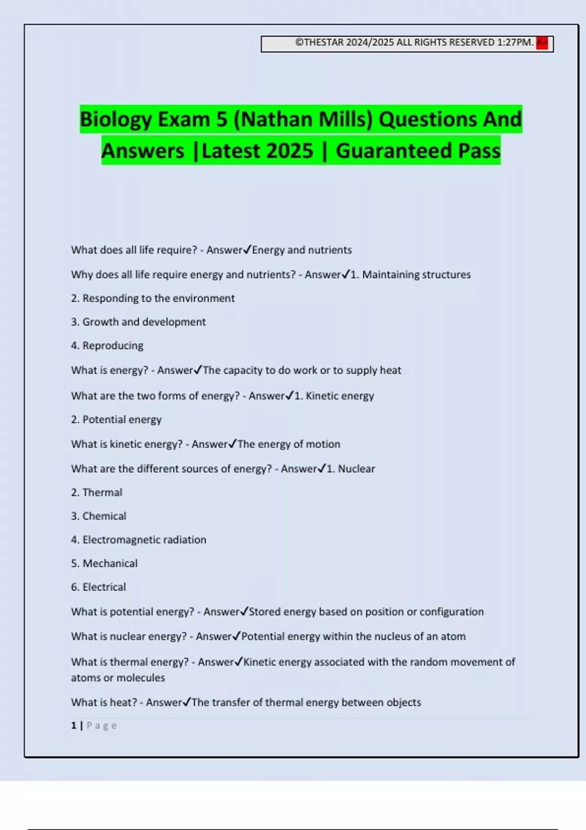 ©THESTAR 2024/2025 ALL RIGHTS RESERVED 1:27PM. A+ 1 | P a g e Biology Exam 5 (Nathan Mills) Questions And Answers |Latest 2025 | Guaranteed Pass What does all life require? - AnswerEnergy and nutrients Why does all life require energy and nutrients? - Answer1. Maintaining structures 2. Responding to the environment 3. Growth and development 4. Reproducing What is energy? - AnswerThe capacity to do work or to supply heat What are the two forms of energy? - Answer1. Kinetic energy 2. Potential energy What is kinetic energy? - AnswerThe energy of motion What are the different sources of energy? - Answer1. Nuclear 2. Thermal 3. Chemical 4. Electromagnetic radiation 5. Mechanical 6. Electrical What is potential energy? - AnswerStored energy based on position or configuration What is nuclear energy? - AnswerPotential energy within the nucleus of an atom What is thermal energy? - AnswerKinetic energy associated with the random movement of atoms or molecules What is heat? - AnswerThe transfer of thermal energy between objects ©THESTAR 2024/2025 ALL RIGHTS RESERVED 1:27PM. A+ 2 | P a g e What is chemical energy? - AnswerPotential energy in the bonds between atoms (based on sharing electrons) What is electromagnetic radiation? - AnswerKinetic energy in the form of radio waves; microwaves; infrared, invisible, and ultraviolet light; and gamma waves. What is electrical energy? - AnswerKinetic energy associated with the movement of charged particles What is mechanical energy? - AnswerKinetic and potential energy of objects What is the first law of thermodynamics? - AnswerEnergy can be neither created nor destroyed. It can only change form. What is the second law of thermodynamics? - AnswerIsolated (closed) systems tend to go towards disorder (amounts of usable energy decrease during energy conversions) What is a spontaneous process? - Answer1. A process that can occur without the input of energy 2. For a process to occur spontaneously it must increase entropy within the system What is an exergonic reaction? - AnswerReactions with a negative ^G (products have less free energy than the reactants) What is an endergonic reaction? - AnswerReactions have a positive ^G (the products have more free energy than reactants) What do enzymes do? - AnswerEncourage reactions by lowing the activation energy What is oxidation? - AnswerRemoval of electrons from a substance The removal of what atom is often associated with oxidation? - AnswerHydrogen Do oxidized substances release or absorb energy in a reaction? - AnswerRelease What is reduction? - AnswerAddition of electrons to a substance The addition of what atom is often associated with reduction? - AnswerHydrogen Does reduction absorb or release energy? - AnswerAbsorb Are oxidation and reduction always together? - AnswerYes (Redox reactions) What is an autotroph? - AnswerAn organism capable of synthesizing complex molecules from CO2 and other simple inorganic molecules using energy from a non biological source What are examples of autotrophs? - Answe