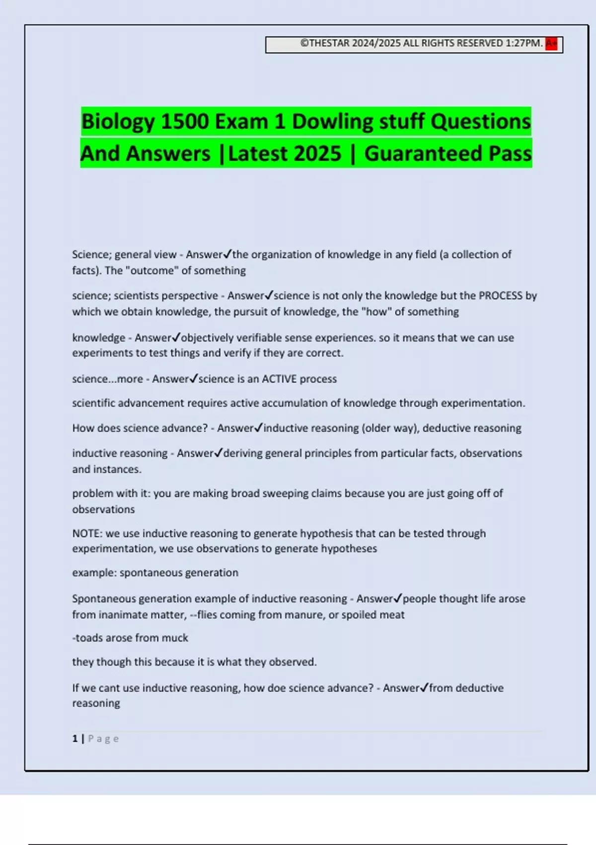 ©THESTAR 2024/2025 ALL RIGHTS RESERVED 1:27PM. A+ 1 | P a g e Biology 1500 Exam 1 Dowling stuff Questions And Answers |Latest 2025 | Guaranteed Pass Science; general view - Answerthe organization of knowledge in any field (a collection of facts). The "outcome" of something science; scientists perspective - Answerscience is not only the knowledge but the PROCESS by which we obtain knowledge, the pursuit of knowledge, the "how" of something knowledge - Answerobjectively verifiable sense experiences. so it means that we can use experiments to test things and verify if they are correct. science...more - Answerscience is an ACTIVE process scientific advancement requires active accumulation of knowledge through experimentation. How does science advance? - Answerinductive reasoning (older way), deductive reasoning inductive reasoning - Answerderiving general principles from particular facts, observations and instances. problem with it: you are making broad sweeping claims because you are just going off of observations NOTE: we use inductive reasoning to generate hypothesis that can be tested through experimentation, we use observations to generate hypotheses example: spontaneous generation Spontaneous generation example of inductive reasoning - Answerpeople thought life arose from inanimate matter, --flies coming from manure, or spoiled meat -toads arose from muck they though this because it is what they observed. If we cant use inductive reasoning, how doe science advance? - Answerfrom deductive reasoning ©THESTAR 2024/2025 ALL RIGHTS RESERVED 1:27PM. A+ 2 | P a g e deductive reasoning - Answerconclusion follows from stated premise uses the scientific method, actively doing things example: Spontaneous generation with Francesco Redi scientific method - Answeran active enterprise, requiring controlled manipulations or a collection of specific kinds of data to answer focused questions. The Scientific Cycle - Answerhypothesis: assumptions based on observations-> predictions: they are tested through experimentation -----------------------------------> Test/Data-------------------------------------------> conclusion: often leads to more questions-------> (then back to hypothesis to answer those more questions) hypothesis - Answera tentative(not certain) assumption made in order to draw out and test its logical or empirical consequences Spontaneous generation example of deductive reasoning - AnswerFrancesco Redi (1626- 1697) hypothesis: flies arise spontaneously from spoiling meat prediction: we should be able to observe maggots arise from the meat regardless of the circumstances Test: place meat in sealed containers and see if maggots arise 3 types of jars; open, gauze with odor, wax no odor conclusion: spontaneous generation os not where flies come from How does science advance part 2? - Answercontinual testing of focused hypotheses (without rejection) result in acceptance of theories Note: this is NOT a highly tentative statement ex: heliocentric theory; the sun is the center is the universe (correct) Types of Questions - Answerdescriptive questions, observational/relational questions, and causal questions Descriptive questions - Answerdirected at describing a set a attributes, not understanding the underlying processes responsible for that appearance (questions that describe something) ex: what are the components of th
