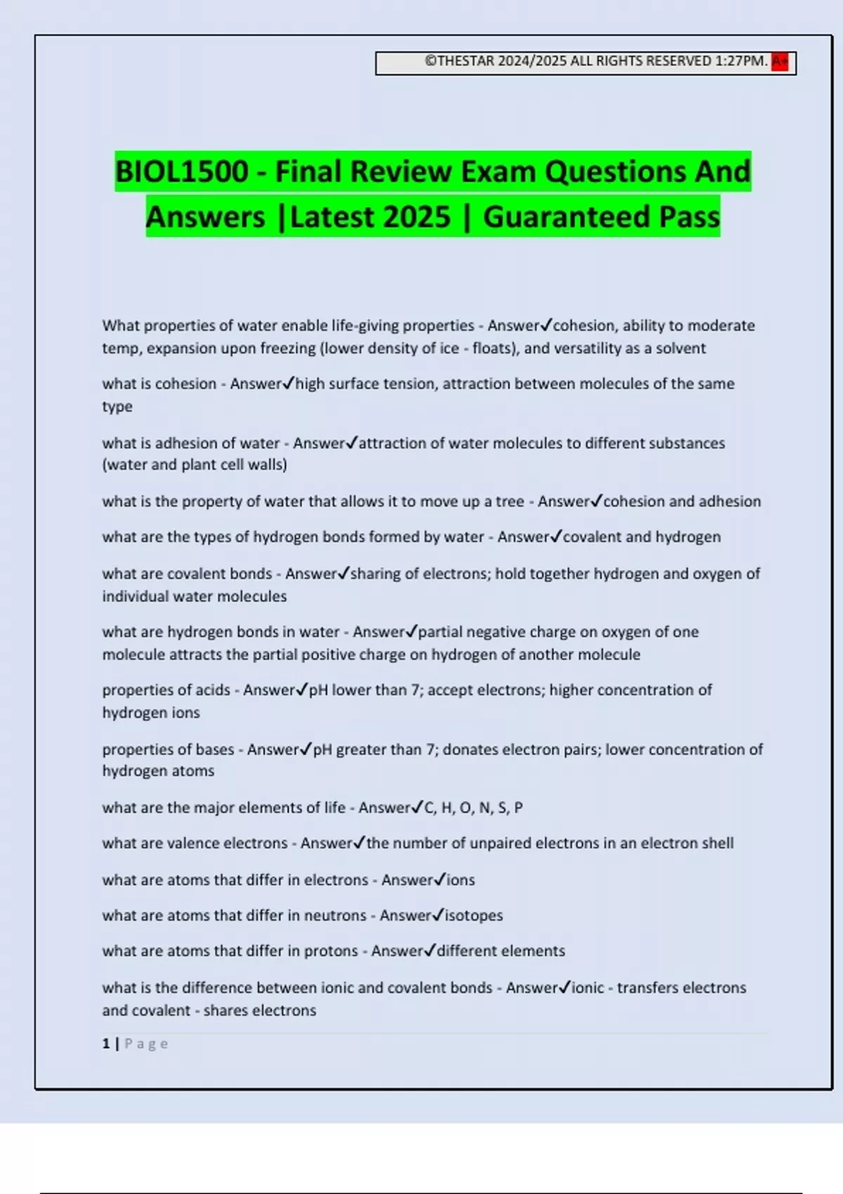 ©THESTAR 2024/2025 ALL RIGHTS RESERVED 1:27PM. A+ 1 | P a g e BIOL1500 - Final Review Exam Questions And Answers |Latest 2025 | Guaranteed Pass What properties of water enable life-giving properties - Answercohesion, ability to moderate temp, expansion upon freezing (lower density of ice - floats), and versatility as a solvent what is cohesion - Answerhigh surface tension, attraction between molecules of the same type what is adhesion of water - Answerattraction of water molecules to different substances (water and plant cell walls) what is the property of water that allows it to move up a tree - Answercohesion and adhesion what are the types of hydrogen bonds formed by water - Answercovalent and hydrogen what are covalent bonds - Answersharing of electrons; hold together hydrogen and oxygen of individual water molecules what are hydrogen bonds in water - Answerpartial negative charge on oxygen of one molecule attracts the partial positive charge on hydrogen of another molecule properties of acids - AnswerpH lower than 7; accept electrons; higher concentration of hydrogen ions properties of bases - AnswerpH greater than 7; donates electron pairs; lower concentration of hydrogen atoms what are the major elements of life - AnswerC, H, O, N, S, P what are valence electrons - Answerthe number of unpaired electrons in an electron shell what are atoms that differ in electrons - Answerions what are atoms that differ in neutrons - Answerisotopes what are atoms that differ in protons - Answerdifferent elements what is the difference between ionic and covalent bonds - Answerionic - transfers electrons and covalent - shares electrons ©THESTAR 2024/2025 ALL RIGHTS RESERVED 1:27PM. A+ 2 | P a g e what are the different types of isomers - Answerstructural, cis-trans, and enantiomers what is a structural isomer - Answersame chemical formula but different shape what is a cis-trans isomer - Answerisomers that have functional groups on opposite sides what is an enantiomer isomer - Answermirror image of each other what are the names of the different functional groups - Answerhydroxyl, carboxyl, carbonyl, phosphate, sulfhydryl, and amino group what is a hydroxyl group composed of - AnswerOH what is a carboxyl group composed of - AnswerCOOH (combo of hydroxyl and carbonyl) what is a carbonyl group composed of - AnswerCO (double bonded) what is an amino group composed of - AnswerNH2 what is a sulfhydryl group composed of - AnswerSH or HS (thiol) what is a phosphate group composed of - AnswerOPO3 or PO4 (found in nucleic acids, ATP, and DNA) what are the four macromolecules - Answercarbohydrates, lipids, proteins, and nucleic acids what are carbohydrates - Answersugars and polymers of sugars what are monomers and polymers of carbohydrates - Answermonosaccharides and polysaccharides what is the most common sugar - Answerglucose (C6H12O6) what is the function of carbohydrates - Answerprovide and store energy what is the covalent bond between two monosaccharides called - Answerglycosidic linkages how are monosaccharides linked together - Answerdehydration synthesis what is the role of polysaccharides - Answerstorage and structure what are examples of carbohydrates and its functions - Answercellulose (in plant cell walls), starch (stores polysaccharides in plants), glycogen (storage in animals), and chitin (structural polysaccharides in insect exoskeletons) what are lipids - Answerfats, oils, and waxes what is the function of lipids - Answerenergy storage, insulation and protection, regulation, and transport ©THESTAR 2024/2025 ALL RIGHTS RESERVED 1:27PM. A+ 3 | P a g e what are phospholipids - Answertwo fatty acids and a phosphate group attached to a glycerol (tails are hydrophobic and phosphate group is hydrophilic) what is the difference between saturated and unsaturated fatty acids - Answersaturated has max # of hydrogen atoms and no double bonds; unsaturated has one or more double bonds what are steroids - Answerlipids characterized by a carbon skeleton made of four fused rings what is a fatty acid made up of - Answercarboxyl group attached to a long carbon skeleton are saturated or unsaturated fats solid or liquid at room temperature - Answersaturated is solid (animal fats) and unsaturated is liquid (plant and fish fats) what is chlolesterol - Answera type of steroid, which is a component of animal cell membranes what makes up more than 50% of dry mass of cells - Answerproteins what are protein monomers and polymers - Answermonomers are amino acids and polymers are polypeptide bonds what are the functions of proteins - Answerdefense, storage, transport, communication, movement, structure, hormonal, receptor, contractile and motor, and enzymatic what are enzymes - Answerproteins that speed up chemical reactions (catalysts) what are the four protein structures - Answerprimary, secondary, tertiary, and quaternary what is the shape of the primary protein structure - Answerlong strands of polypeptides what is the shape of secondary protein structure - Answeralpha helixes (coils) and beta pleated sheets (folds) what is the shape of tertiary protein structure - Answerfunctional structure - 3D what is the shape of quaternary protein structure and what are two common - Answermultiple polypeptide chains that react; collagen and hemoglobin what is the function of nucleic acids in - Answerstore, transmit, and express genetic information what are nucleic acids made up of - Answernucleotides what makes up a nucleotides - Answersugar, phosphate, and a nitrogenous base what two nitrogenous bases a