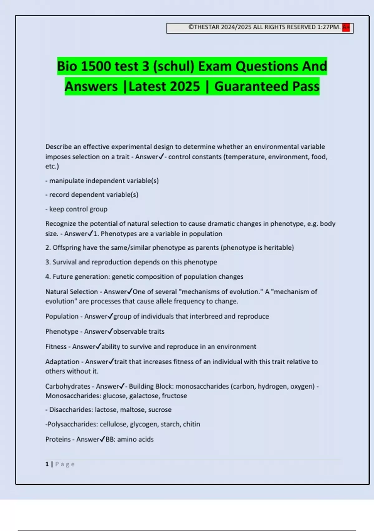 ©THESTAR 2024/2025 ALL RIGHTS RESERVED 1:27PM. A+ 1 | P a g e Bio 1500 test 3 (schul) Exam Questions And Answers |Latest 2025 | Guaranteed Pass Describe an effective experimental design to determine whether an environmental variable imposes selection on a trait - Answer- control constants (temperature, environment, food, etc.) - manipulate independent variable(s) - record dependent variable(s) - keep control group Recognize the potential of natural selection to cause dramatic changes in phenotype, e.g. body size. - Answer1. Phenotypes are a variable in population 2. Offspring have the same/similar phenotype as parents (phenotype is heritable) 3. Survival and reproduction depends on this phenotype 4. Future generation: genetic composition of population changes Natural Selection - AnswerOne of several "mechanisms of evolution." A "mechanism of evolution" are processes that cause allele frequency to change. Population - Answergroup of individuals that interbreed and reproduce Phenotype - Answerobservable traits Fitness - Answerability to survive and reproduce in an environment Adaptation - Answertrait that increases fitness of an individual with this trait relative to others without it. Carbohydrates - Answer- Building Block: monosaccharides (carbon, hydrogen, oxygen) - Monosaccharides: glucose, galactose, fructose - Disaccharides: lactose, maltose, sucrose -Polysaccharides: cellulose, glycogen, starch, chitin Proteins - AnswerBB: amin