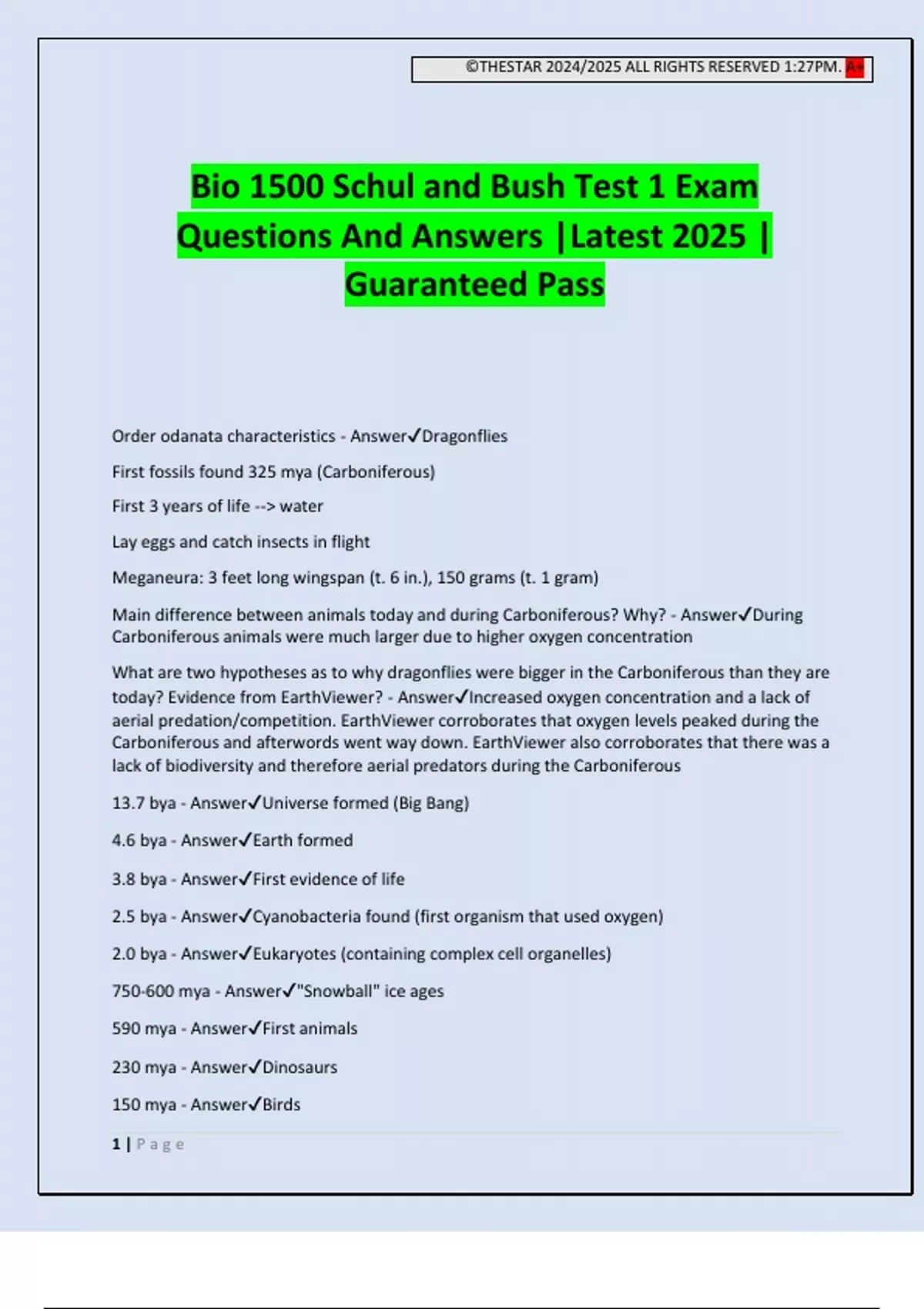 ©THESTAR 2024/2025 ALL RIGHTS RESERVED 1:27PM. A+ 1 | P a g e Bio 1500 Schul and Bush Test 1 Exam Questions And Answers |Latest 2025 | Guaranteed Pass Order odanata characteristics - AnswerDragonflies First fossils found 325 mya (Carboniferous) First 3 years of life --> water Lay eggs and catch insects in flight Meganeura: 3 feet long wingspan (t. 6 in.), 150 grams (t. 1 gram) Main difference between animals today and during Carboniferous? Why? - AnswerDuring Carboniferous animals were much larger due to higher oxygen concentration What are two hypotheses as to why dragonflies were bigger in the Carboniferous than they are today? Evidence from EarthViewer? - AnswerIncreased oxygen concentration and a lack of aerial predation/competition. EarthViewer corroborates that oxygen levels peaked during the Carboniferous and afterwords went way down. EarthViewer also corroborates that there was a lack of biodiversity and therefore aerial predators during the Carboniferous 13.7 bya - AnswerUniverse formed (Big Bang) 4.6 bya - AnswerEarth formed 3.8 bya - AnswerFirst evidence of life 2.5 bya - AnswerCyanobacteria found (first organism that used oxygen) 2.0 bya - AnswerEukaryotes (containing complex cell organelles) 750-600 mya - Answer"Snowball" ice ages 590 mya - AnswerFirst anima