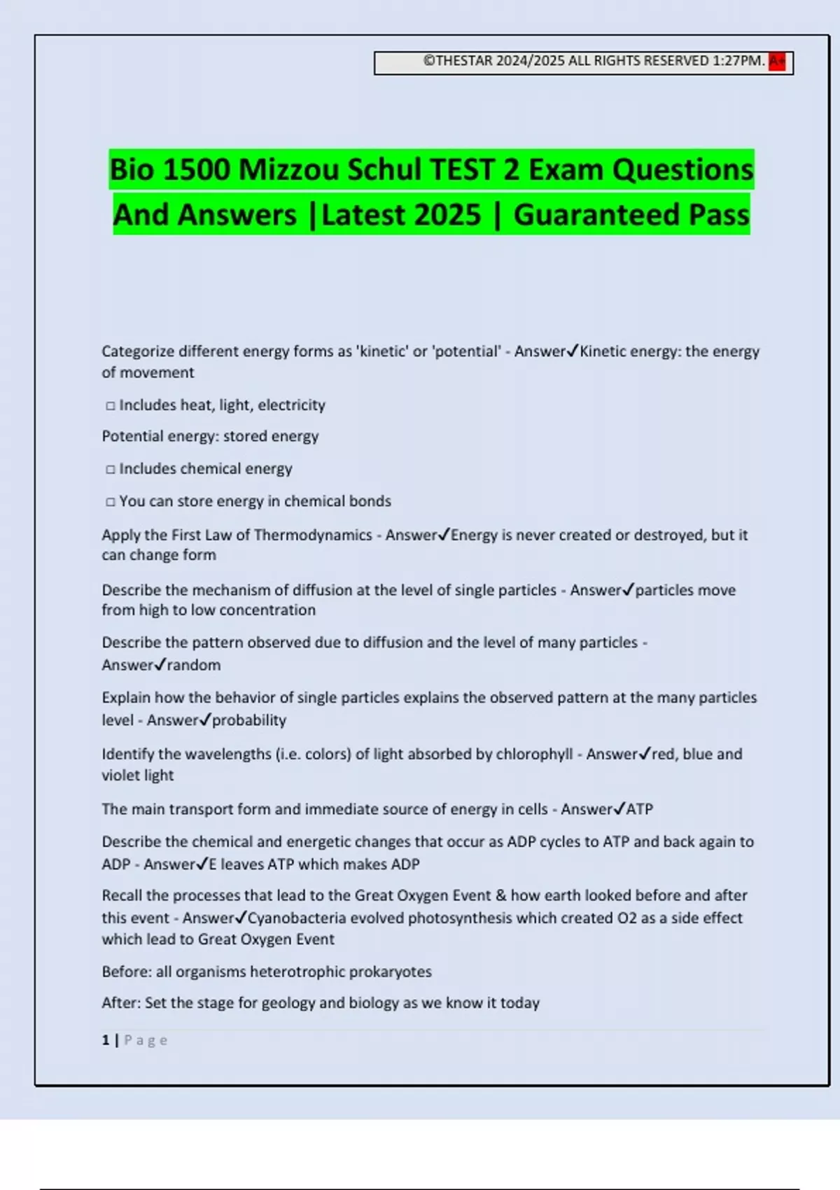 ©THESTAR 2024/2025 ALL RIGHTS RESERVED 1:27PM. A+ 1 | P a g e Bio 1500 Mizzou Schul TEST 2 Exam Questions And Answers |Latest 2025 | Guaranteed Pass Categorize different energy forms as 'kinetic' or 'potential' - AnswerKinetic energy: the energy of movement □ Includes heat, light, electricity Potential energy: stored energy □ Includes chemical energy □ You can store energy in chemical bonds Apply the First Law of Thermodynamics - AnswerEnergy is never created or destroyed, but it can change form Describe the mechanism of diffusion at the level of single particles - Answerparticles move from high to low concentration Describe the pattern observed due to diffusion and the level of many particles - Answerrandom Explain how the behavior of single particles explains the observed pattern at the many particles level - Answerprobability Identify the wavelengths (i.e. colors) of light absorbed by chlorophyll - Answerred, blue and violet light The main transport form and immediate source of energy in cells - AnswerATP Describe the chemical and energetic changes that occur as ADP cycles to ATP and back again to ADP - AnswerE leaves ATP which makes ADP Recall the processes that lead to the Great Oxygen Event & how earth looked before and after this event - AnswerCyanobacteria evolved photosynthesis which created O2 as a side effect which lead to Great Oxygen Event Before: all organisms heterotrophic prokaryotes After: Set the stage for geology and bi