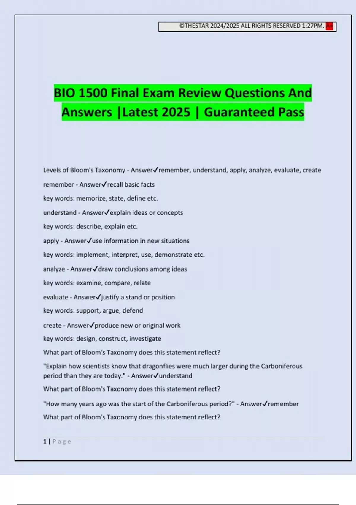 ©THESTAR 2024/2025 ALL RIGHTS RESERVED 1:27PM. A+ 1 | P a g e BIO 1500 Final Exam Review Questions And Answers |Latest 2025 | Guaranteed Pass Levels of Bloom's Taxonomy - Answerremember, understand, apply, analyze, evaluate, create remember - Answerrecall basic facts key words: memorize, state, define etc. understand - Answerexplain ideas or concepts key words: describe, explain etc. apply - Answeruse information in new situations key words: implement, interpret, use, demonstrate etc. analyze - Answerdraw conclusions among ideas key words: examine, compare, relate evaluate - Answerjustify a stand or position key words: support, argue, defend create - Answerproduce new or original work key words: design, construct, investigate What part of Bloom's Taxonomy does this statement reflect? "Explain how scientists know that dragonflies were much larger during the Carboniferous period than they are today." - Answerunderstand What part of Bloom's Taxonomy does this statement reflect? "How many years ago was the start of the Carboniferous period?" - Answerremember What part of Bloom's Taxonomy does this statement reflect? ©THESTAR 2024/2025 ALL RIGHTS RESERVED 1:27PM. A+ 2 | P a g e "Use your understanding of the factors influencing dragonfly size to predict how the size of terrestrial invertebrates has changed over deep time." - Answerapply What part of Bloom's Taxonomy does this statement reflect? "How strong is the evidence supporting the conclusion that predation limited the size of dragonflies following the evolution of birds? Do you agree with this conclusion?" - Answerevaluate What part of Bloom's Taxonomy does this statement reflect? "design an experiment to test the hypothesis that higher levels of O2 in the atmosphere allow insects to grow to a large size." - Answercreate What part of Bloom's Taxonomy does this statement reflect? "Examine the role of natural selection in the observed changes in dragonfly size over time. What traits were under selection pressure in dragonflies and aerial predators?" - Answeranalyze What experimental design could help determine if higher O2 levels select for larger bodies? - Answerex: 2 groups of flies, one in low/normal O2 environment and other in high O2 environment for several generations and observe growth. At the end, put the flies that were in the high O2 environment in a low O2 environment to test if the difference in their size became genetic as a result of selection How can natural selection cause changes in phenotype? - AnswerSelection favors organisms that are more fit for their environment, so organisms that have alleles that make them more apt to survive and reproduce will be selected. The selection of different alleles may favor mutations in genes which cause the organism to present a different phenotype. what are the four classes of organic molecules? - Answer- carbohydrates - proteins - lipids - nucleic acids properties of carbohydrates - Answer- a group of macromolecules that are a vital source of energy for the cell and provide structural