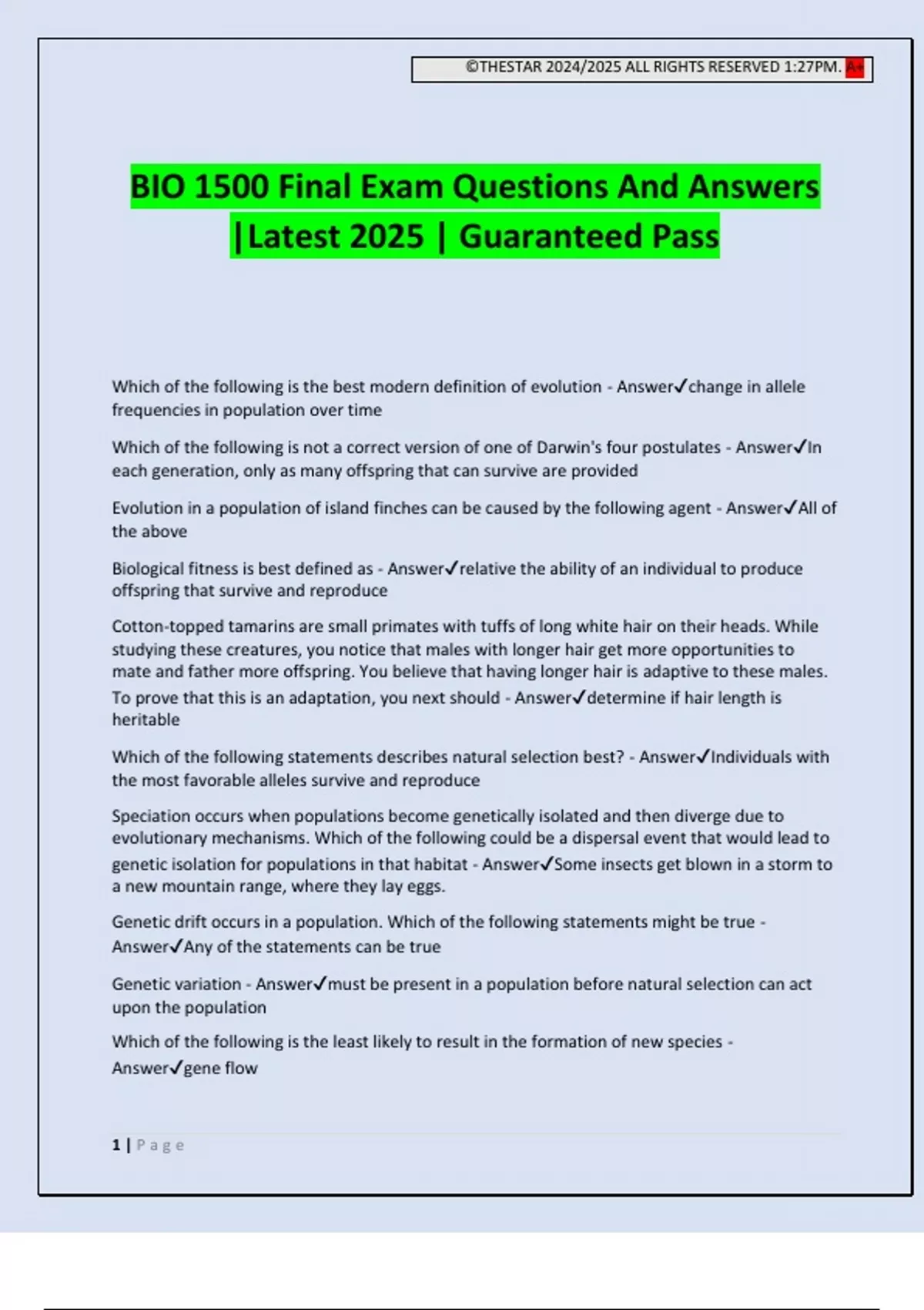 BIO 1500 Final Exam Questions And Answers