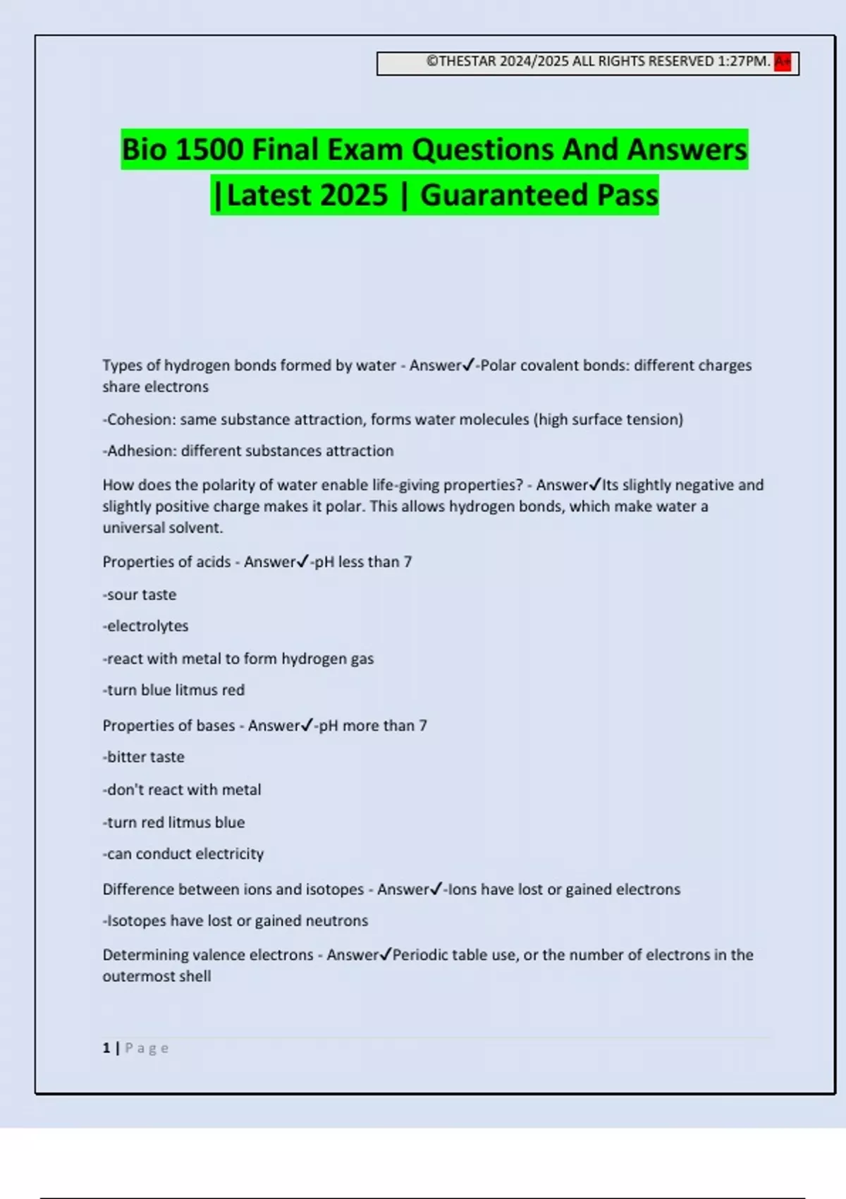 ©THESTAR 2024/2025 ALL RIGHTS RESERVED 1:27PM. A+ 1 | P a g e Bio 1500 Final Exam Questions And Answers |Latest 2025 | Guaranteed Pass Types of hydrogen bonds formed by water - Answer-Polar covalent bonds: different charges share electrons -Cohesion: same substance attraction, forms water molecules (high surface tension) -Adhesion: different substances attraction How does the polarity of water enable life-giving properties? - AnswerIts slightly negative and slightly positive charge makes it polar. This allows hydrogen bonds, which make water a universal solvent. Properties of acids - Answer-pH less than 7 -sour taste -electrolytes -react with metal to form hydrogen gas -turn blue litmus red Properties of bases - Answer-pH more than 7 -bitter taste -don't react with metal -turn red litmus blue -can conduct electricity Difference between ions and isotopes - Answer-Ions have lost or gained electrons -Isotopes have lost or gained neutrons Determining valence electrons - AnswerPeriodic table use, or the number of electrons in the outermost shell ©THESTAR 2024/2025 ALL RIGHTS RESERVED 1:27PM. A+ 2 | P a g e Hydroxyl group - AnswerA functional group consisting of a hydrogen atom joined to an oxygen atom by a polar covalent bond. Molecules possessing this group are soluble in water and are called alcohols. Methyl group - AnswerA chemical group consisting of a carbon bonded to three hydrogen atoms. The methyl group may be attached to a carbon or to a different atom. Carbonyl group - AnswerA chemical group consisting of a carbon atom linked by a double bond to an oxygen atom Carboxyl group - AnswerA functional group consisting of a single carbon atom double-bonded to an oxygen atom and also bonded to a hydroxyl group. Amino group - AnswerA functional group that consists of a nitrogen atom bonded to two hydrogen atoms Phosphate group - AnswerA functional group consisting of a phosphorus atom covalently bonded to four oxygen atoms Sulfhydryl group - AnswerA functional group consisting of a sulfur atom bonded to a hydrogen atom (—SH). Isomers - AnswerCompounds with the same formula but different structures Structural isomers - AnswerHave different covalent arrangements of their atoms Cis-trans isomers - AnswerHave the same covalent bonds but differ in spatial arrangements Enantiomers - AnswerIsomers that are mirror images of each other Lipids (fat, hydrophobic) - Answer-Makeup: glycerol & fatty acids -Function: move and store energy -Examples: fats and oils (triglycerides), steroids, cholesterol, phospholipids Proteins - Answer-Makeup: amino acid chain with covalent peptide bonds (4 structures) -Function: catalysts, building blocks, enzymes, hormones, build and repair muscle -Examples: keratin, actin, myosin, hemoglobin Carbohydrates - Answer-Makeup: sugars (simple, polysaccharides, etc.) -Function: fuel/energy source and building material, control metabolism and insulin -Examples: cellulose, starch, glycogen, chitin, monosaccharides, glucose, etc. Nucleic acids - Answer-Makeup: nucleotides (nitrogenous base, sugar, and phosphate), DNA or RNA -Function: store, transmit, and express hereditary information