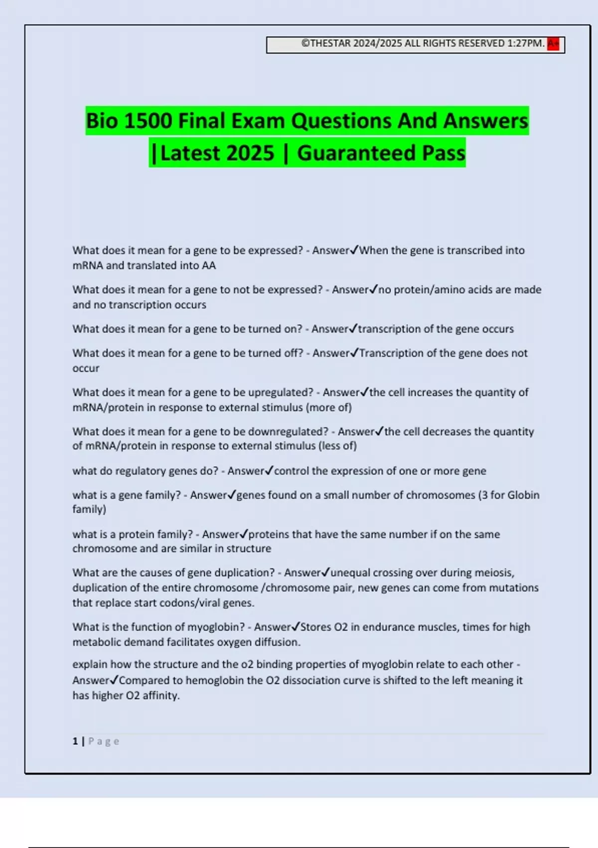 ©THESTAR 2024/2025 ALL RIGHTS RESERVED 1:27PM. A+ 1 | P a g e Bio 1500 Final Exam Questions And Answers |Latest 2025 | Guaranteed Pass What does it mean for a gene to be expressed? - AnswerWhen the gene is transcribed into mRNA and translated into AA What does it mean for a gene to not be expressed? - Answerno protein/amino acids are made and no transcription occurs What does it mean for a gene to be turned on? - Answertranscription of the gene occurs What does it mean for a gene to be turned off? - AnswerTranscription of the gene does not occur What does it mean for a gene to be upregulated? - Answerthe cell increases the quantity of mRNA/protein in response to external stimulus (more of) What does it mean for a gene to be downregulated? - Answerthe cell decreases the quantity of mRNA/protein in response to external stimulus (less of) what do regulatory genes do? - Answercontrol the expression of one or more gene what is a gene family? - Answergenes found on a small number of chromosomes (3 for Globin family) what is a protein family? - Answerproteins that have the same number if on the same chromosome and are similar in structure What are the causes of gene duplication? - Answerunequal crossing over during meiosis, duplication of the entire chromosome /chromosome pair, new genes can come from mutations that replace start codons/viral genes. What is the function of myoglobin? - AnswerStores O2 in endurance muscles, times for high metabolic demand facilitates oxygen diffusion. explain how the structure and the o2 binding properties of myoglobin relate to each other - AnswerCompared to hemoglobin the O2 dissociation curve is shifted to the left meaning it has higher O2 affinity. ©THESTAR 2024/2025 ALL RIGHTS RESERVED 1:27PM. A+ 2 | P a g e how does the binding of molecules other than O2 (e.g. CO, NO, H2O) to hemoglobin affect the color of meat? - AnswerCO2 causes smoked meat to turn pink, myoglobin stores the O2 in muscle cells (responsible for color before during and after cooking depending on how much myglobin is exposed to gas). Myoglobin brown = H20 binding instead of O2, myoglobin pink = NO or CO binding. why is meat color not necessarily an indicator of meat's freshness? - AnswerMeat in a packages use nitric acid (NO) for a bright pink color and if the meat stays this color it means it is fresh because the HB is not binding to anything else. what is the oxygen environment of the womb? - AnswerPoor oxygen environment/low Po2, therefor fetal blood mixes with O2 and deoxygenated blood from mom lowering mom's overall po2 how does a fetus obtain oxygen? - AnswerObtains oxygen from mom's blood being released to the fetal's umbilical artery and vein What is the Hb-O2 dissociation curve like compared to adult Hb to fetal hemoglobin? - AnswerFetal Hb has higher O2 affinity than adults (left shift) How are the developmental changes in Hb related to gene duplication and to changes in gene expression? - AnswerDifferent Hb could be due to different tissue types How do you interpret evolutionary relationships in a phylogenetic tree? - AnswerDON'T count nodes, look at common ancestors for evolutionary relationships. Same distance = same evolving time what is a clade? - AnswerAll lineages connect together at a common ancestor Interpret traits in living species based on hypothesized gains or losses of a trait in a phylogenetic tree - AnswerWhether or not species are alive in a phylogenic tree determines what traits will continue to pass on. what is convergent evolution? - Answerwhen two different organisms share the same phenotype/trait because they share similar way of life/pressures. how do we know that the Hb adaptations of birds living at high altitudes in different parts of the world is an example of convergent evolution? - AnswerDifferent locations but same adaptions due to same altitude pressures what is the biological species concept? - AnswerSpecies are a group of organisms with the potential to breed with each other and produce live fertile offspring What are the steps involved in the most common form of speciation? - Answer1. Population splits into two isolated groups 2. Genetic differences build up between populations due to different selective pressures