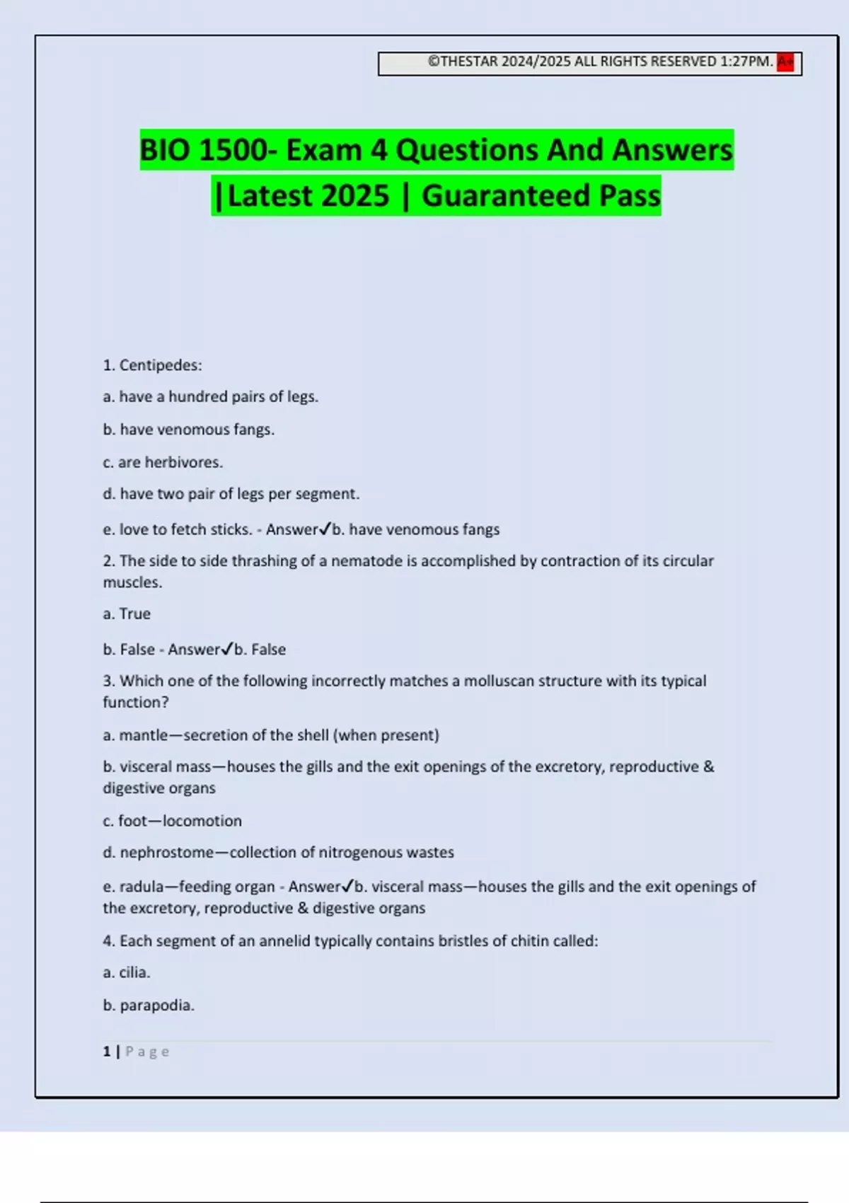 BIO 1500- Exam 4 Questions And Answers