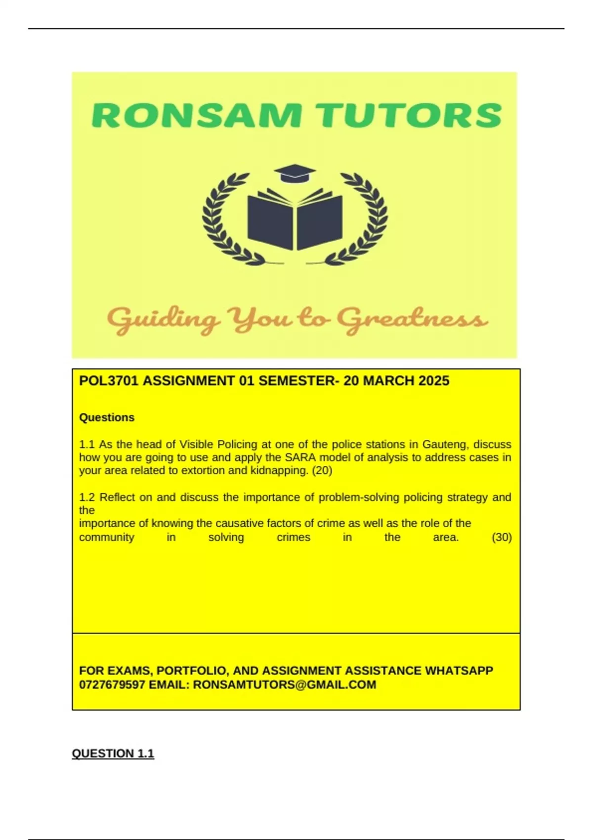POL3701– Assignment 01 Semester 1 Answers 1.1 As the head of Visible Policing at one of the police stations in Gauteng, discuss how you are going to use and apply the SARA model of analysis to address cases in your area related to extortion and kidnapping. (20) 1.2 Reflect on and discuss the importance of problem-solving policing strategy and the importance of knowing the causative factors of crime as well as the role of the community in solving crimes in the area. (30)