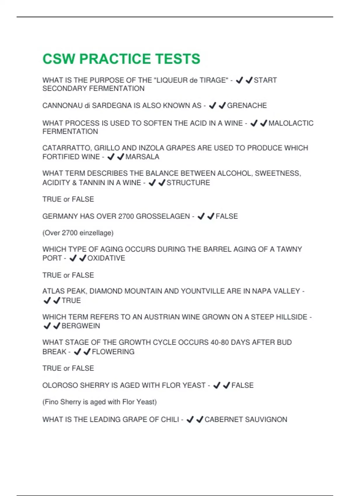 WHAT IS THE PURPOSE OF THE "LIQUEUR de TIRAGE" - ️️START SECONDARY FERMENTATION CANNONAU di SARDEGNA IS ALSO KNOWN AS - ️️GRENACHE WHAT PROCESS IS USED TO SOFTEN THE ACID IN A WINE - ️️MALOLACTIC FERMENTATION CATARRATTO, GRILLO AND INZOLA GRAPES ARE USED TO PRODUCE WHICH FORTIFIED WINE - ️️MARSALA WHAT TERM DESCRIBES THE BALANCE BETWEEN ALCOHOL, SWEETNESS, ACIDITY & TANNIN IN A WINE - ️️STRUCTURE TRUE or FALSE GERMANY HAS OVER 2700 GROSSELAGEN - ️️FALSE (Over 2700 einzellage) WHICH TYPE OF AGING OCCURS DURING THE BARREL AGING OF A TAWNY PORT - ️️OXIDATIVE