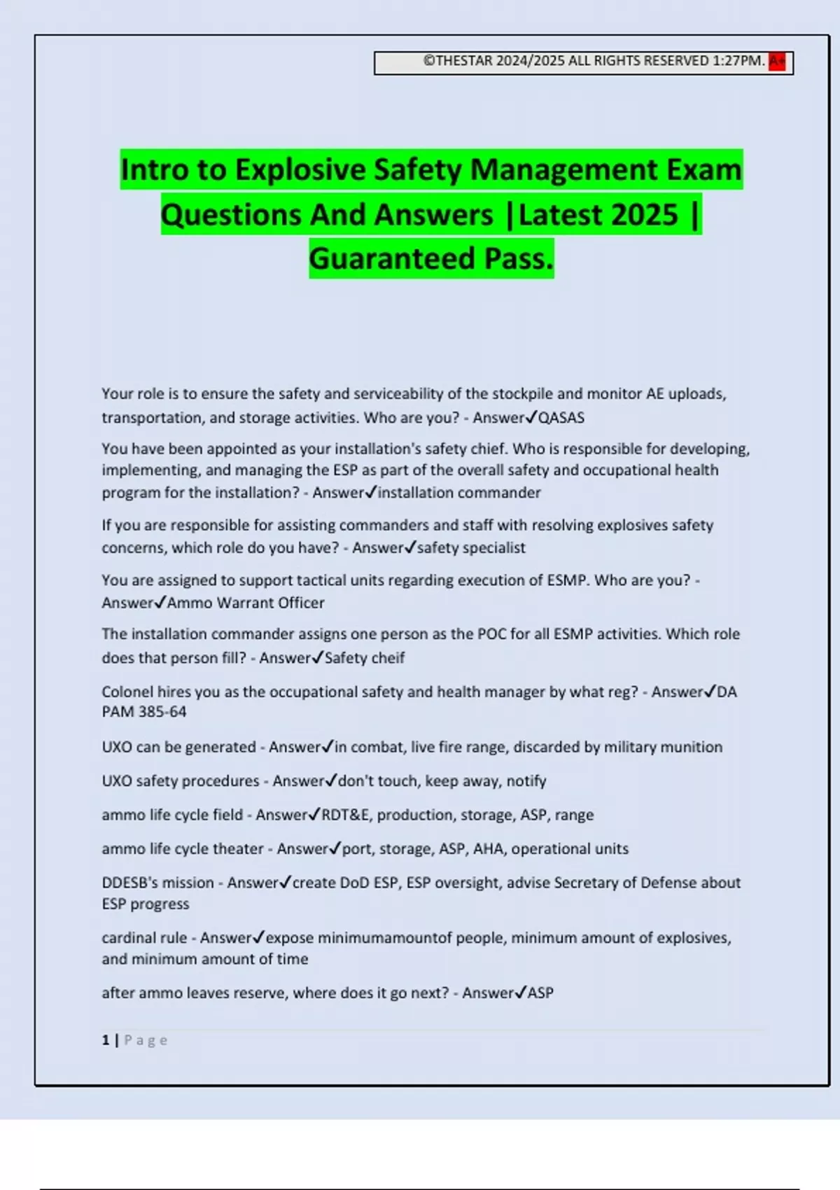 ©THESTAR 2024/2025 ALL RIGHTS RESERVED 1:27PM. A+ 1 | P a g e Intro to Explosive Safety Management Exam Questions And Answers |Latest 2025 | Guaranteed Pass. Your role is to ensure the safety and serviceability of the stockpile and monitor AE uploads, transportation, and storage activities. Who are you? - AnswerQASAS You have been appointed as your installation's safety chief. Who is responsible for developing, implementing, and managing the ESP as part of the overall safety and occupational health program for the installation? - Answerinstallation commander If you are responsible for assisting commanders and staff with resolving explosives safety concerns, which role do you have? - Answersafety specialist You are assigned to support tactical units regarding execution of ESMP. Who are you? - AnswerAmmo Warrant Officer The installation commander assigns one person as the POC for all ESMP activities. Which role does that person fill? - AnswerSafety cheif Colonel hires you as the occupational safety and health manager by what reg? - AnswerDA PAM 385-64 UXO can be generated - Answerin combat, live fire range, discarded by military munition UXO safety procedures - Answerdon't touch, keep away, notify ammo life cycle field - AnswerRDT&E, production, storage, ASP, range ammo life cycle theater - Answerport, storage, ASP, AHA, operational units DDESB's mission - Answercreate DoD ESP, ESP oversight, advise Secretary of Defense about ESP progress cardinal rule - Answerexpose minimumamountof people, minimum amount of explosives, and minimum amount of time after ammo leaves reserve, where does it go ne
