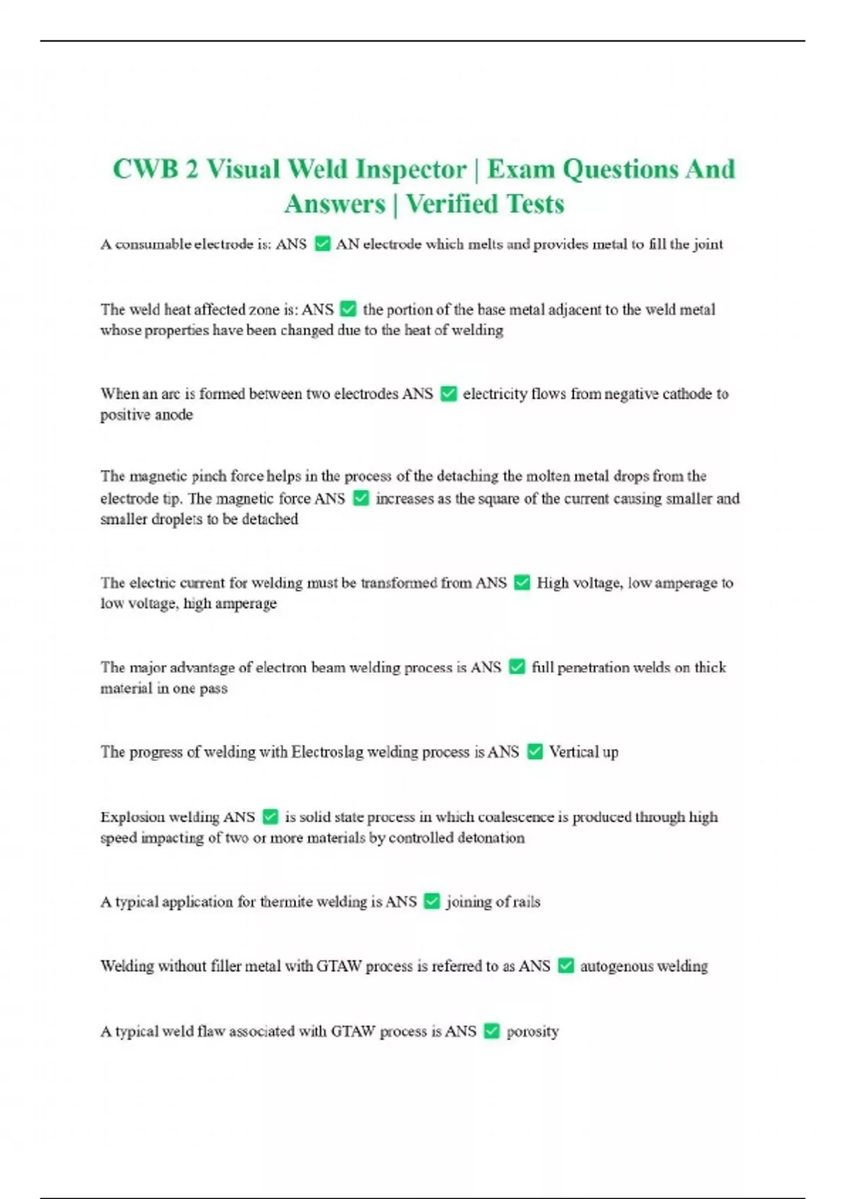 CWB 2 Visual Weld Inspector | Exam Questions And Answers | Verified Tests A consumable electrode is: ANS AN electrode which melts and provides metal to fill the joint The weld heat affected zone is: ANS the portion of the base metal adjacent to the weld metal whose properties have been changed due to the heat of welding When an arc is formed between two electrodes ANS electricity flows from negative cathode to positive anode The magnetic pinch force helps in the process of the detaching the molten metal drops from the electrode tip. The magnetic force ANS increases as the square of the current causing smaller and smaller droplets to be detached The electric current for welding must be transformed from ANS High voltage, low amperage to low voltage, high amperage The major advantage of electron beam welding process is ANS full penetration welds on thick material in one pass