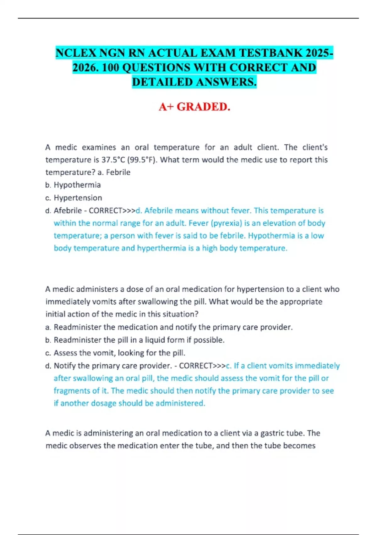 NCLEX NGN RN ACTUAL EXAM TESTBANK . 100 QUESTIONS WITH CORRECT AND DETAILED ANSWERS. A+ GRADED. A medic examines an oral temperature for an adult client. The client's temperature is 37.5°C (99.5°F). What term would the medic use to report this temperature? a. Febrile b. Hypothermia c. Hypertension d. Afebrile - CORRECT>>>d. Afebrile means without fever. This temperature is within the normal range for an adult. Fever (pyrexia) is an elevation of body temperature; a person with fever is said to be febrile. Hypothermia is a low body temperature and hyperthermia is a high body temperature. A medic administers a dose of an oral medication for hypertension to a client who immediately vomits after swallowing the pill. What would be the appropriate initial action of the medic in this situation? a. Readminister the medication and notify the primary care provider. b. Readminister the pill in a liquid form if possible. c. Assess the vomit, looking for the pill. d. Notify the primary care provider. - CORRECT>>>c. If a client vomits immediately after swallowing an oral pill, the medic should assess the vomit for the pill or fragments of it. The medic should then notify the primary care provider to see if another dosage should be administered. A medic is administering an oral medication to a client via a gastric tube. The medic observes the medication enter the tube, and then the tube becomes clogged. What would be the appropriate initial action of the medic in this situation? a. Attempt to dislodge the medication with a 10-mL syringe. b. Notify the primary care provider. c. Remove the tube and replace it with another tube. d. Flush the tube with 60 mL of water. - CORRECT>>>a. If medication becomes clogged in a gastric tube, the medic should attach a 10-mL syringe on the end of the tube and pull back and lightly apply pressure to the plunger in a repetitive motion to attempt to dislodge the medication. If the medication does not move through the tube, the medic should notify the primary care provider, who may request the tube be replaced. A medic who is administering medications to clients in an acute care setting studies the pharmacokinetics of the drugs being administered. Which statements accurately describe these mechanisms of action? Select all that apply. a. Distribution occurs after a drug has been absorbed into the bloodstream and is made available to body fluids and tissues. b. Metabolism is the process by which a drug is transferred from its site of entry into the body to the bloodstream. c. Absorption is the change of a drug from its original form to a new form, usually occurring in the liver. d. During first-pass effect, drugs move from the intestinal lumen to the liver by way of the portal vein instead of going into the system's circulation. e. The gastrointestinal tract, as well as sweat, salivary, and mammary glands, are routes of drug absorption. f. Excretion is the process of removing a drug, or its metabolites (products of metabolis - CORRECT>>>a, d, f. Distribution occurs after a drug has been absorbed into the bloodstream and the drug is distributed throughout the body, becoming available to body fluids and body tissues. Some drugs move from the intestinal lumen to the liver by way of the portal vein and do not go directly into the systemic circulation following oral absorption. This is called the first-pass effect, or hepatic first pass. Excretion is the process of removing a drug or its metabolites (products of metabolism) from the body. Absorption is the process by which a drug is transferred from its site of entry into the body to the bloodstream. Metabolism, or biotransformation, is the change of a drug from its original form to a new form. The liver is the primary site for drug metabolism. The gastrointestinal tract, as well as sweat, salivary, and mammary glands, are routes of drug excretion. A medic is reconstituting powdered medication in a vial. Which action is a recommended step in this process? a. The medic draws up the proper amount of powered medication into the syringe. b. The medic inserts the needle through the rubber stopper of the diluent vial. c. The medic gently agitates the powdered medication vial to mix the powder and diluent completely. d. The medic draws up the prescribed amount of medication while holding the syringe horizontally at eye level. - CORRECT>>>c. When reconstituting powdered medication in a vial, the medic should draw up the appropriate amount of diluent into the syringe, insert the needle through the center of the self-sealing stopper on the powdered medication vial, inject the diluent into the powdered medication vial, remove the needle from the vial and replace the cap, and gently agitate the vial to mix the powdered medication and diluent completely. The medic should then draw up the prescribed amount of medication while holding the syringe vertically and at eye level. A medication order reads: "K-Dur, 20 mEq po b.i.d." When and how does the medic correctly give this drug? a. Daily at bedtime by subcutaneous route b. Every other day by mouth c. Twice a day by the oral route d. Once a week by transdermal patch - CORRECT>>>c. The abbreviation "b.i.d." refers to twice-a-day administration. po (by mouth) refers to administration by the oral route. A medic is preparing medications for clients in the ICU. The medic is aware that there are client variables that may affect the absorption of these medications. Which statements accurately describe these variables? Select all that apply. a. Clients in certain ethnic groups obtain therapeutic responses at lower doses or higher doses than those usually prescribed. b. Some people experience the same response with a placebo as with the active drug used in studies. c. People with liver disease metabolize drugs more quickly than people with normal liver functioning. d. A client who receives a pain medication in a noisy environment may not receive full benefit from the medication's effects. e. Oral medica