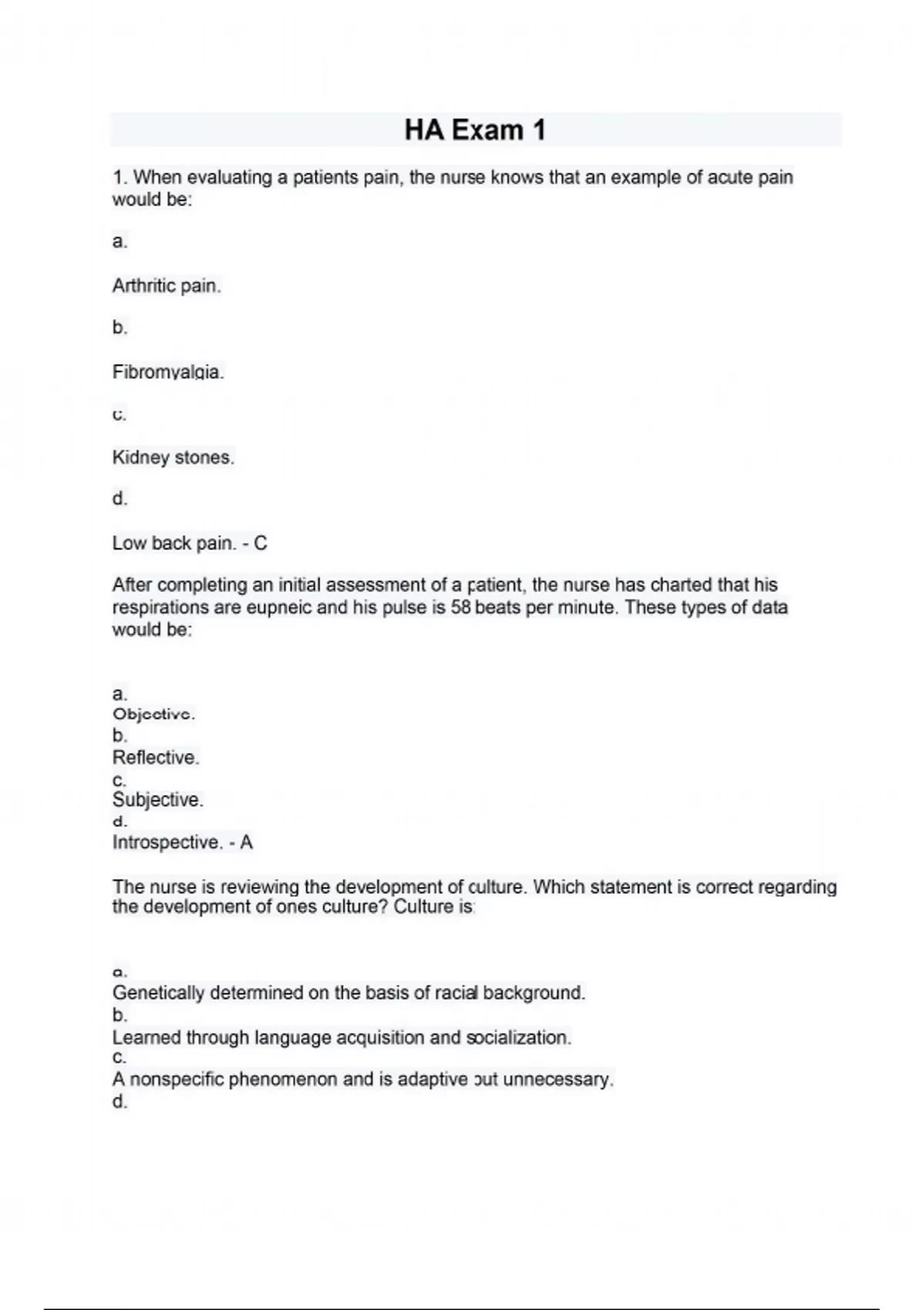 1. When evaluating a patients pain, the nurse knows that an example of acute pain would be: a. Arthritic pain. b. Fibromyalgia. c. Kidney stones. d. Low back pain. - C After completing an initial assessment of a patient, the nurse has charted that his respirations are eupneic and his pulse is 58 beats per minute. These types of data would be: a. Objective. b. Reflective. c. Subjective. d. Introspective. - A The nurse is reviewing the development of culture. Which statement is correct regarding the development of ones culture? Culture is: a. Genetically determined on the basis of racial background. b. Learned through language acquisition and socialization. c. A nonspecific phenomenon and is adaptive but unnecessary. d. Biologically determined on the basis of physical characteristics. - B The nurse is preparing to conduct a health history. Which of these statements best describes the purpose of a health history? a. To provide an opportunity for interaction between the patient and the nurse b. To provide a form for obtaining the patients biographic information c. To document the normal and abnormal findings of a physical assessment d. To provide a database of subjective information about the patients past and current health - D 1. The nurse is performing a general survey. Which action is a component of the general survey? a. Observing the patients body stature and nutritional status b. Interpreting the subjective information the patient has reported c. Measuring the patients temperature, pulse, respirations, and blood pressure d. Observing specific body systems while performing the physical assessment - A Amplitude is a. the intensity (soft or loud) of a sound b. the number of vibrations per second c. the length of time the note lingers d. the subjective difference in a sound's distinct overtones - A The nurse is conducting an interview with a woman who has recently learned that she is pregnant and who has come to the clinic today to begin prenatal care. The woman states that she and her husband are excited about the pregnancy but have a few questions. She looks nervously at her hands during the interview and sighs loudly. Considering the concept of communication, which statement does the nurse know to be most accurate? The woman is: a. Excited about her pregnancy but nervous about the labor. b. Exhibiting verbal and nonverbal behaviors that do not match. c. Excited about her pregnancy, but her husband is not and this is upsetting to her. d. Not excited about her pregnancy but believes the nurse will negatively respond to her if she states this. - B 2. Which statement indicates that the nurse understands the pain experienced by an older adult? a. Older adults must learn to tolerate pain. b. Pain is a normal process of aging and is to be expected. c. Pain indicates a pathologic condition or an injury and is not a normal process of aging. d. Older individuals perceive pain to a lesser degree than do younger individuals. - C Receiving is a part of the communication process. Which receiver is most likely to misinterpret a message sent by a health care professional? a. Well-adjusted adolescent who came in for a sports physical b. Recovering alcoholic who came in for a basic physical examination c. Man whose wife has just been diagnosed with lung cancer d. Man with a hearing impairment who uses sign language to communicate and who has an interpreter with him - C A patient tells the nurse that he is very nervous, is nauseated, and feels hot. These types of data would be: a. Objective. b. Reflective. c. Subjective. d. Introspective. - C During a class on the aspects of culture, the nurse shares that culture has four basic characteristics. Which statement correctly reflects one of these characteristics? a. Cultures are static and unchanging, despite changes around them. b. Cultures are never specific, which makes them hard to identify. c. Culture is most clearly reflected in a persons language and behavior. d. Culture adapts to specific environmental factors and available natural resources. - D When the nurse is evaluating the reliability of a patients responses, which of these statements would be correct? The patient: a. Has a history of drug abuse and therefore is not reliable. b. Provided consistent information and therefore is reliable. c. Smiled throughout interview and therefore is assumed reliable. d. Would not answer questions concerning stress and therefore is not reliable. - B 2. When measuring a patients weight, the nurse is aware of which of these guidelines? a. The patient is always weighed wearing only his or her undergarments. b. The type of scale does not matter, as long as the weights are similar from day to day. c. The patient may leave on his or her jacket and shoes as long as these are documented next to the weight. d. Attempts should be made to weigh the patient at approximately the same time of day, if a sequence of weights is necessary. - D A 59-year-old patient tells the nurse that he has ulcerative colitis. He has been having black stools for the last 24 hours. How would the nurse best document his reason for seeking care? a. J.M. is a 59-year-old man seeking treatment for ulcerative colitis. b. J.M. came into the clinic complaining of having black stools for the past 24 hours. c. J.M. is a 59-year-old man who states that he has ulcerative colitis and wants it checked. d. J.M. is a 59-year-old man who states that he has been having black stools for the past 24 hours. - D Deep palpation is used to a. elicit deep tendon reflexes b. evaluate surface characteristics c. determine density of a structure d. identify abdominal contents - D 3. A patients weekly blood pressure readings for 2 months have ranged between 124/84 mm Hg and 136/88 mm Hg, with an average reading of 126/86 mm Hg. The nurse knows that this blood pressure falls within which blood pressure category? a. Normal blood pressure b. Prehypertension c. Stage 1 hypertension d. Stage 2 hypertension - B During a seminar o