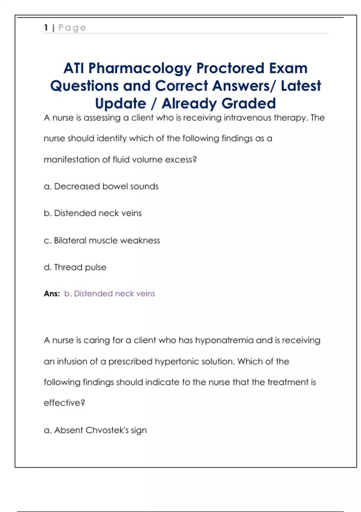 A nurse is assessing a client who is receiving intravenous therapy. The nurse should identify which of the following findings as a manifestation of fluid volume excess? a. Decreased bowel sounds b. Distended neck veins c. Bilateral muscle weakness d. Thread pulse Ans: b. Distended neck veins A nurse is caring for a client who has hyponatremia and is receiving an infusion of a prescribed hypertonic solution. Which of the following findings should indicate to the nurse that the treatment is effective? a. Absent Chvostek's sign 2 | P a g e b. Improved cognition c. Decreased vomiting d. Cardiac arrhythmias absent Ans: b. Improved cognition A nurse is teaching a client who has a new prescription for a nitroglycerin transdermal patch. Which of the following instructions should the nurse include? a. "Discontinue the patch if you experience a headache." b. "Apply a new patch if you have chest pain." c. "Cover the patch with dry gauze when taking a shower." d. "Remove the patch prior to g