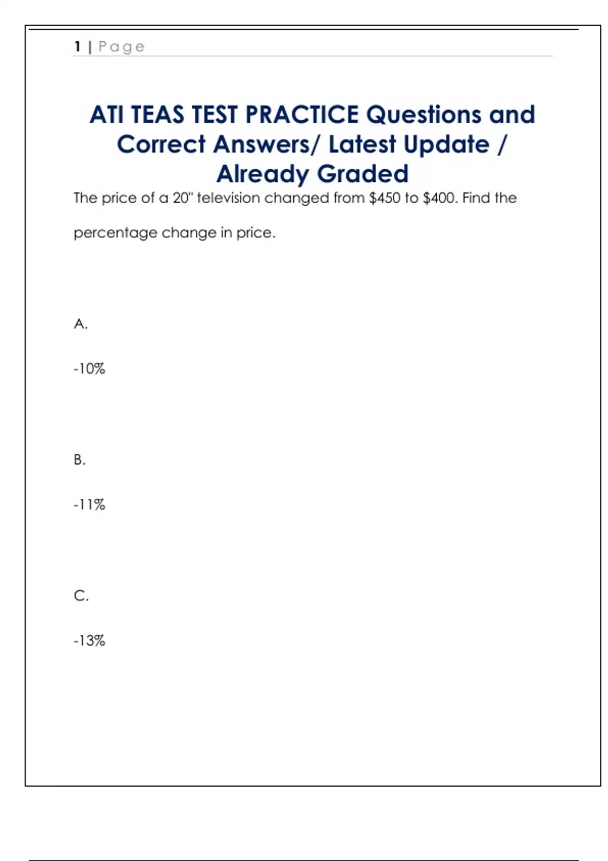 The price of a 20" television changed from $450 to $400. Find the percentage change in price. A. -10% B. -11% C. -13% 2 | P a g e D. -15% 3 | P a g e Ans: Correct answer: -11% Change in price: 450 - 400 = 50 To determine the percentage change, divide the change in price by the initial price: 50 = 0.1111 450 Multiply by 100 to determine the percentage: 0.1111 × 100 = 11.11% Because the price decreased, the change in price is negative: -11.11%, or about -11% Which of the following is not a type of natural lipid? 4 | P a g