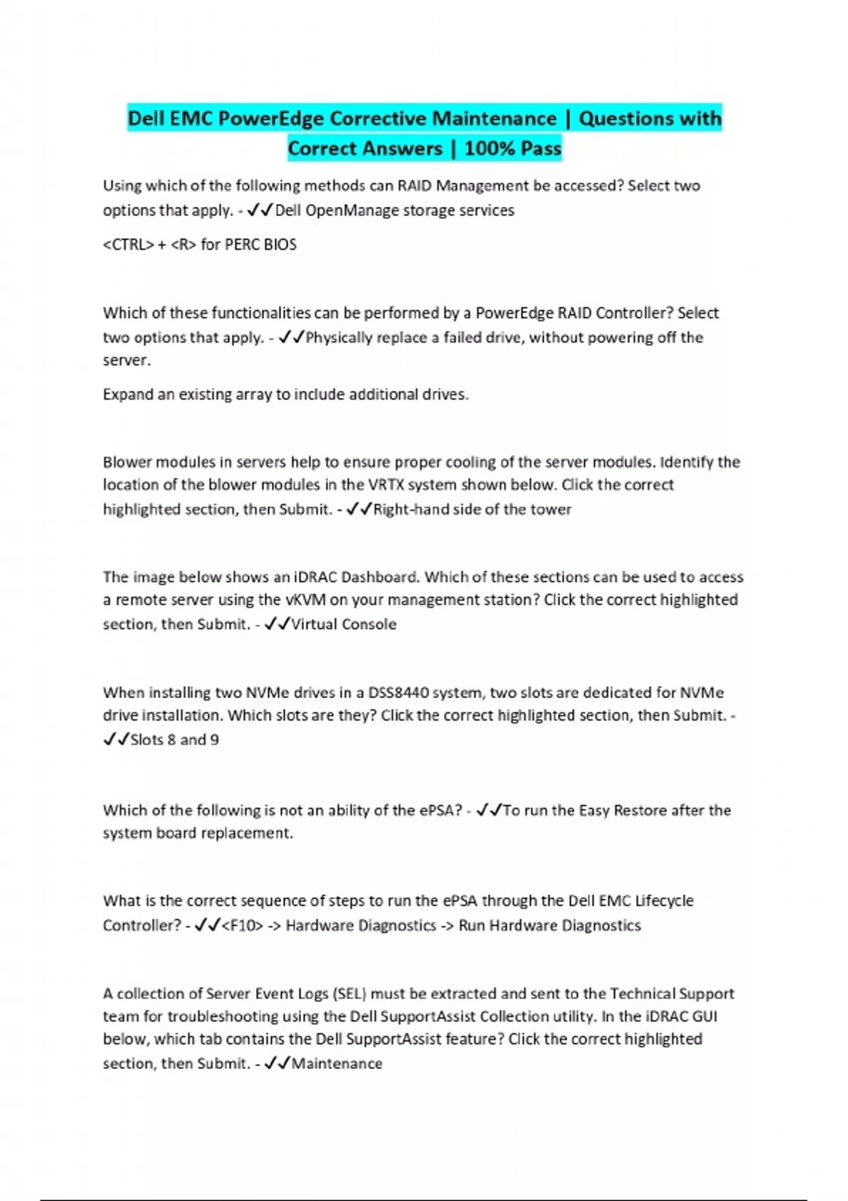 Dell EMC PowerEdge Corrective Maintenance | Questions with Correct Answers | 100% Pass