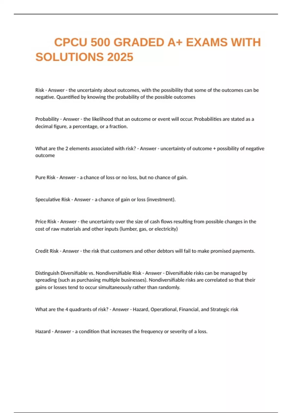 Pure Risk - Answer - a chance of loss or no loss, but no chance of gain.