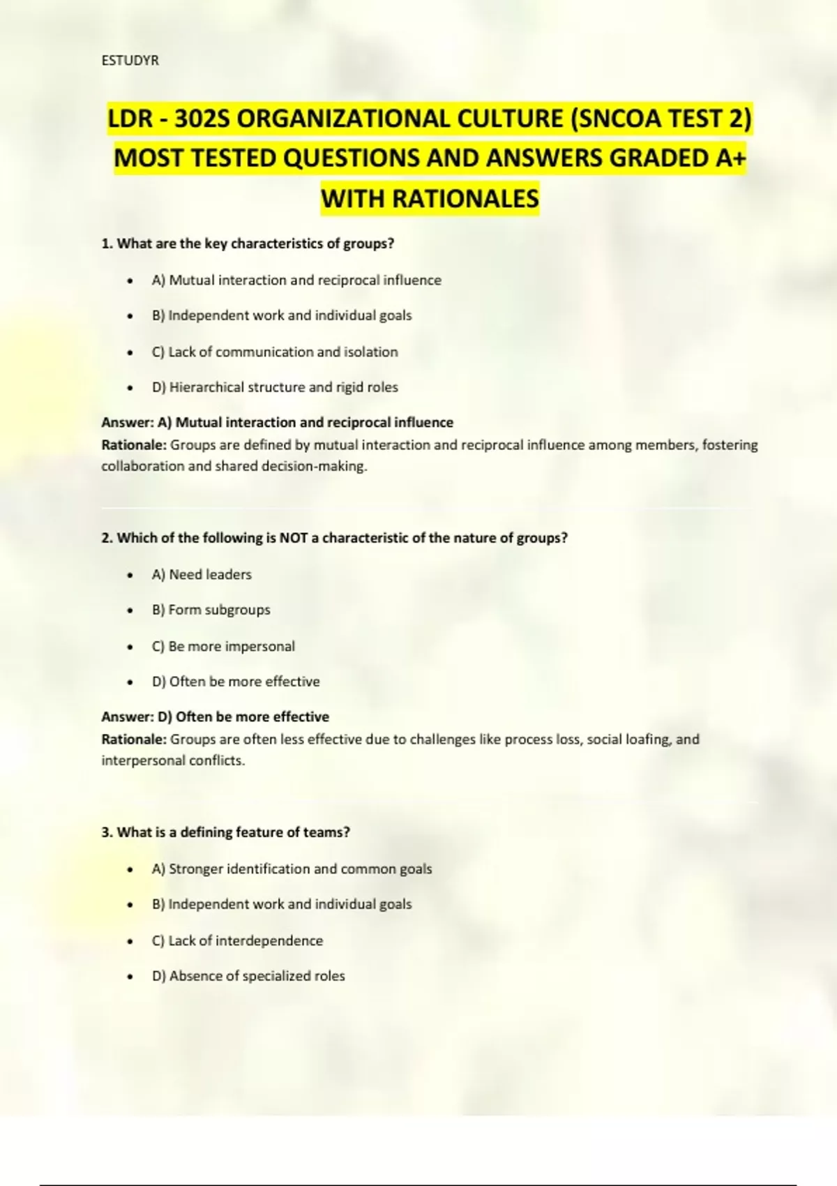 LDR - 302S ORGANIZATIONAL CULTURE (SNCOA TEST 2) MOST TESTED QUESTIONS AND ANSWERS GRADED A+ WITH RATIONALES