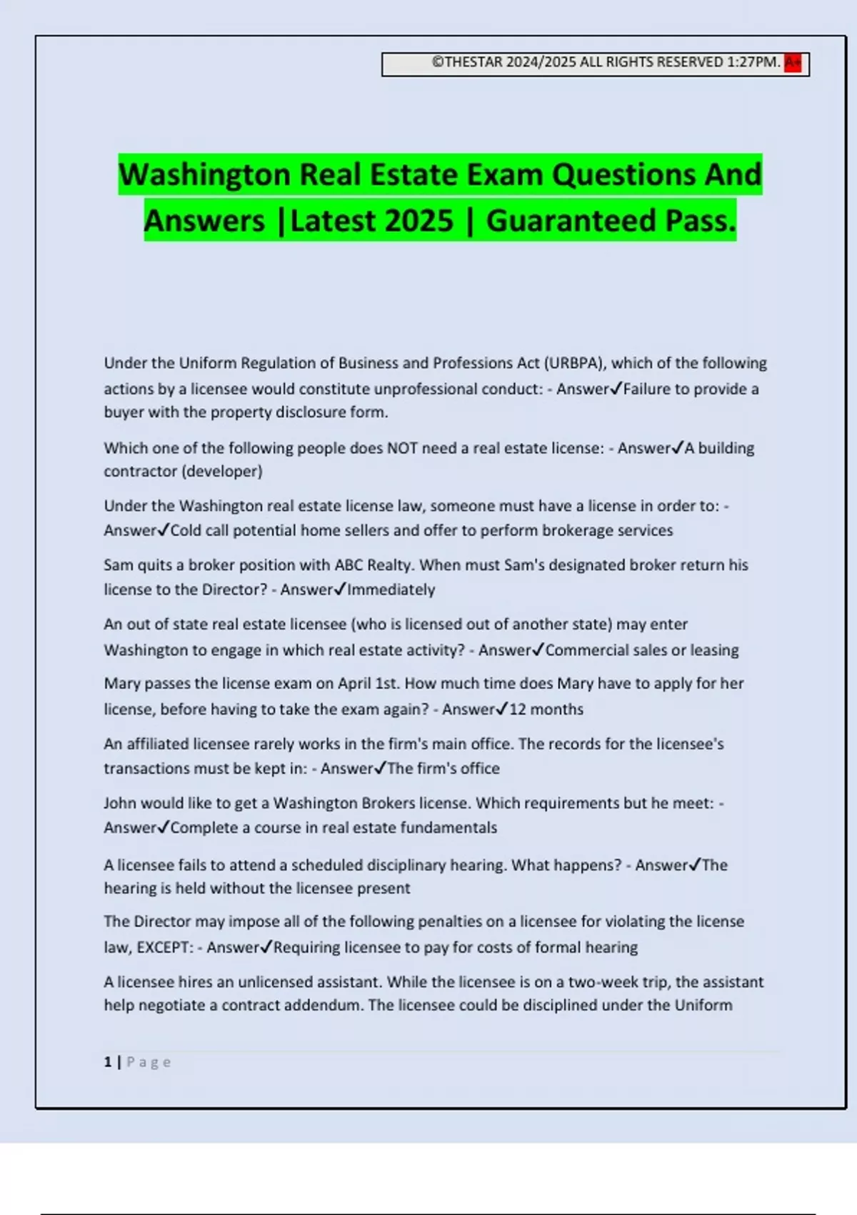 ©THESTAR 2024/2025 ALL RIGHTS RESERVED 1:27PM. A+ 1 | P a g e Washington Real Estate Exam Questions And Answers |Latest 2025 | Guaranteed Pass. Under the Uniform Regulation of Business and Professions Act (URBPA), which of the following actions by a licensee would constitute unprofessional conduct: - AnswerFailure to provide a buyer with the property disclosure form. Which one of the following people does NOT need a real estate license: - AnswerA building contractor (developer) Under the Washington real estate license law, someone must have a license in order to: - AnswerCold call potential home sellers and offer to perform brokerage services Sam quits a broker position with ABC Realty. When must Sam's designated broker return his license to the Director? - AnswerImmediately An out of state real estate licensee (who is licensed out of another state) may enter Washington to engage in which real estate activity? - AnswerCommercial sales or leasing Mary passes the license exam on April 1st. How much time does Mary have to apply for her license, before having to take the exam again? - Answer12 months An affiliated licensee rarely works in the firm's main office. The records for the licensee's transactions must be kept in: - AnswerThe firm's office John would like to get a Washington Brokers license. Which requirements but he meet: - AnswerComplete a course in real estate fundamentals A licensee fails to attend a scheduled disciplinary hearing. What happens? - AnswerThe hearing is held without the licensee present The Director may impose all of the following penalties on a licensee for violating the license law, EXCEPT: - AnswerRequiri