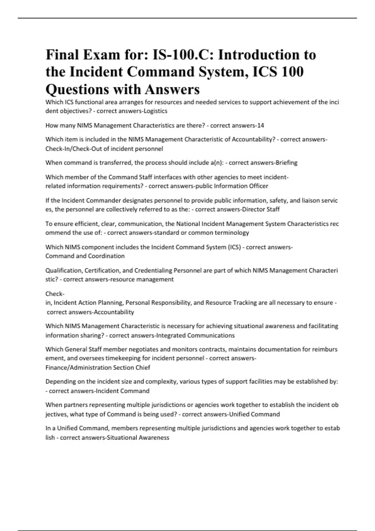 Final Exam for: IS-100.C: Introduction to the Incident Command System, ICS 100 Questions with Answers
