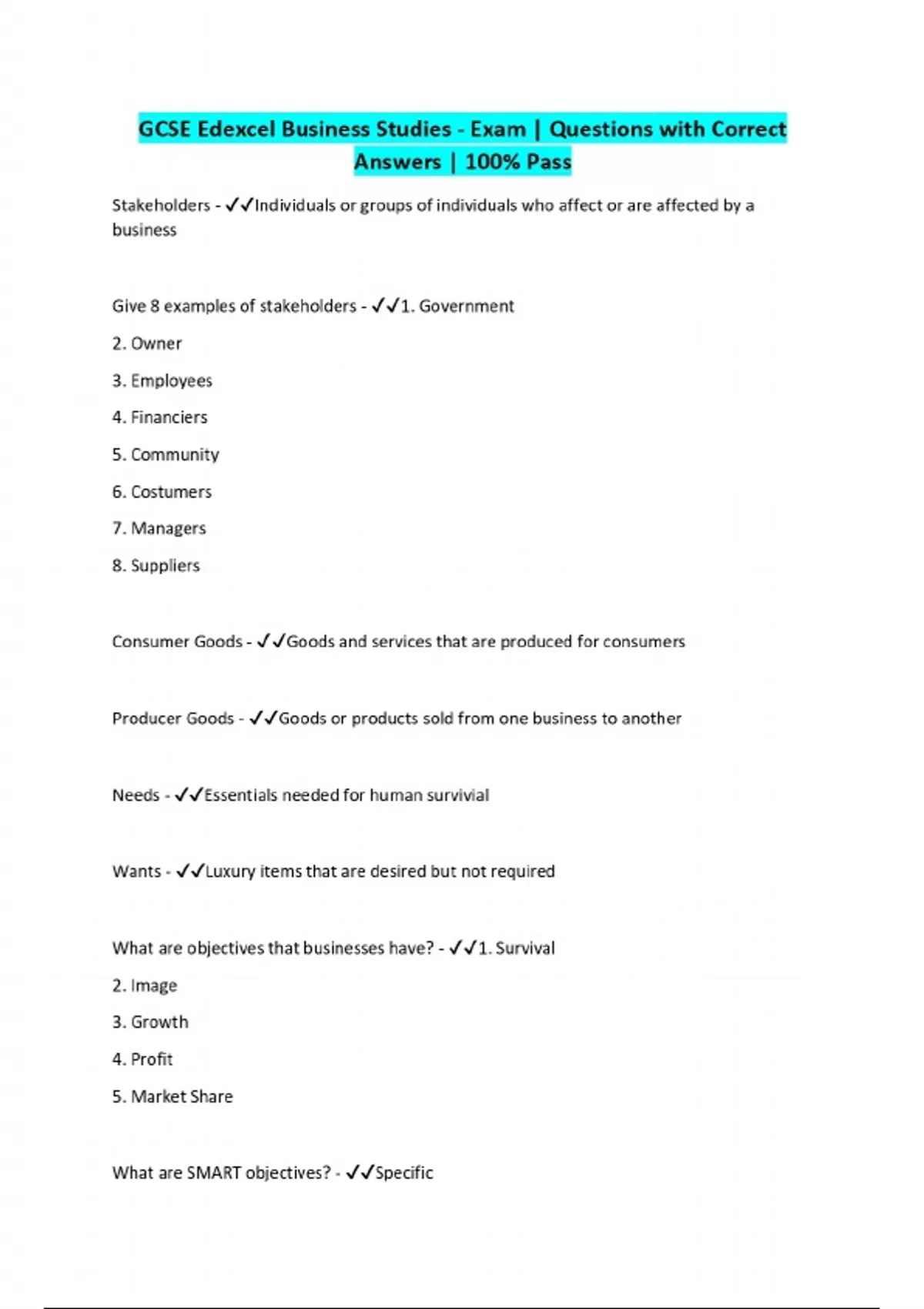 GCSE Edexcel Business Studies - Exam | Questions with Correct Answers | 100% Pass