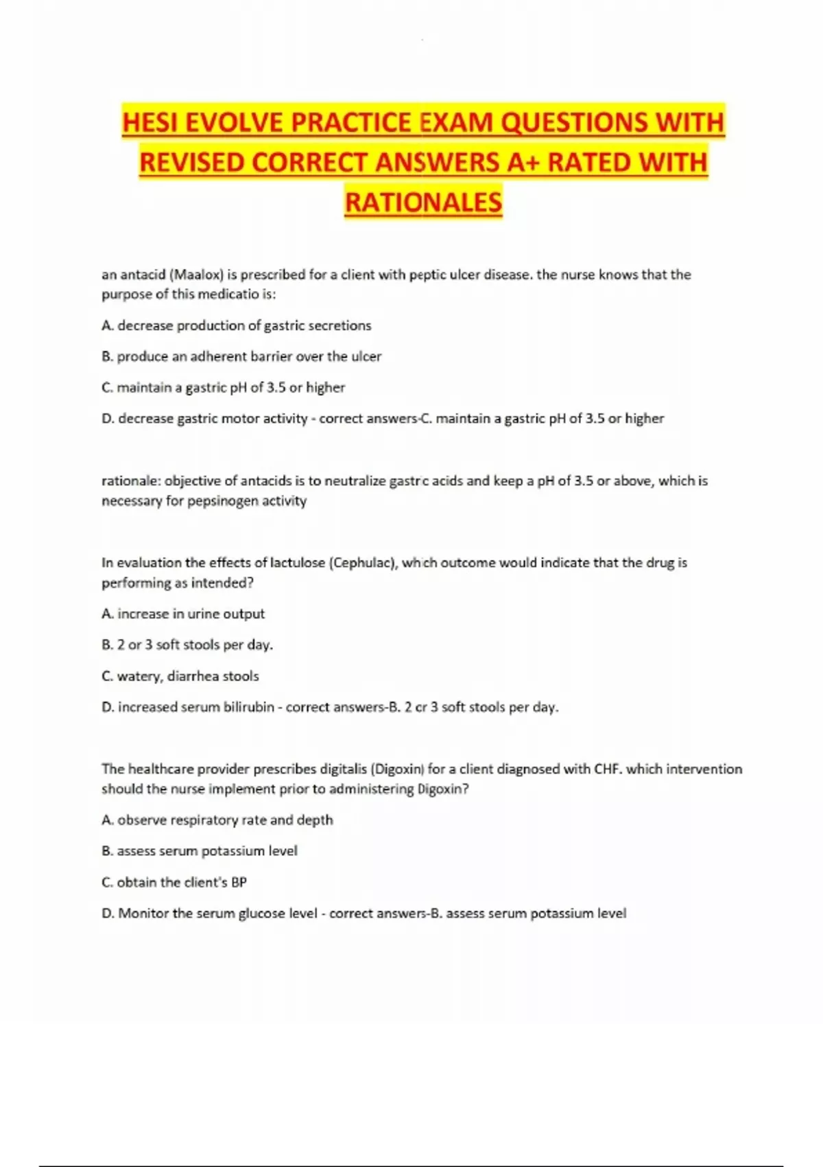 HESI EVOLVE PRACTICE EXAM QUESTIONS WITH REVISED CORRECT ANSWERS A+ RATED WITH RATIONALES an antacid (Maalox) is prescribed for a client with peptic ulcer disease. the nurse knows that the purpose of this medicatio is: A. decrease production of gastric secretions B. produce an adherent barrier over the ulcer C. maintain a gastric pH of 3.5 or higher D. decrease gastric motor activity - correct answers-C. maintain a gastric pH of 3.5 or higher rationale: objective of antacids is to neutralize gastric acids and keep a pH of 3.5 or above, which is necessary for pepsinogen activity In evaluation the effects of lactulose (Cephulac), which outcome would indicate that the drug is performing as intended? A. increase in urine output B. 2 or 3 soft stools per day. C. watery, diarrhea stools D. increased serum bilirubin - correct answers-B. 2 or 3 soft stools per day. The healthcare provider prescribes digitalis (Digoxin) for a client diagnosed with CHF. which intervention should the nurse implement prior to administering Digoxin? A. observe respiratory rate and depth B. assess serum potassium level C. obtain the client's BP D. Monitor the serum glucose level - correct answers-B. assess serum potassium level