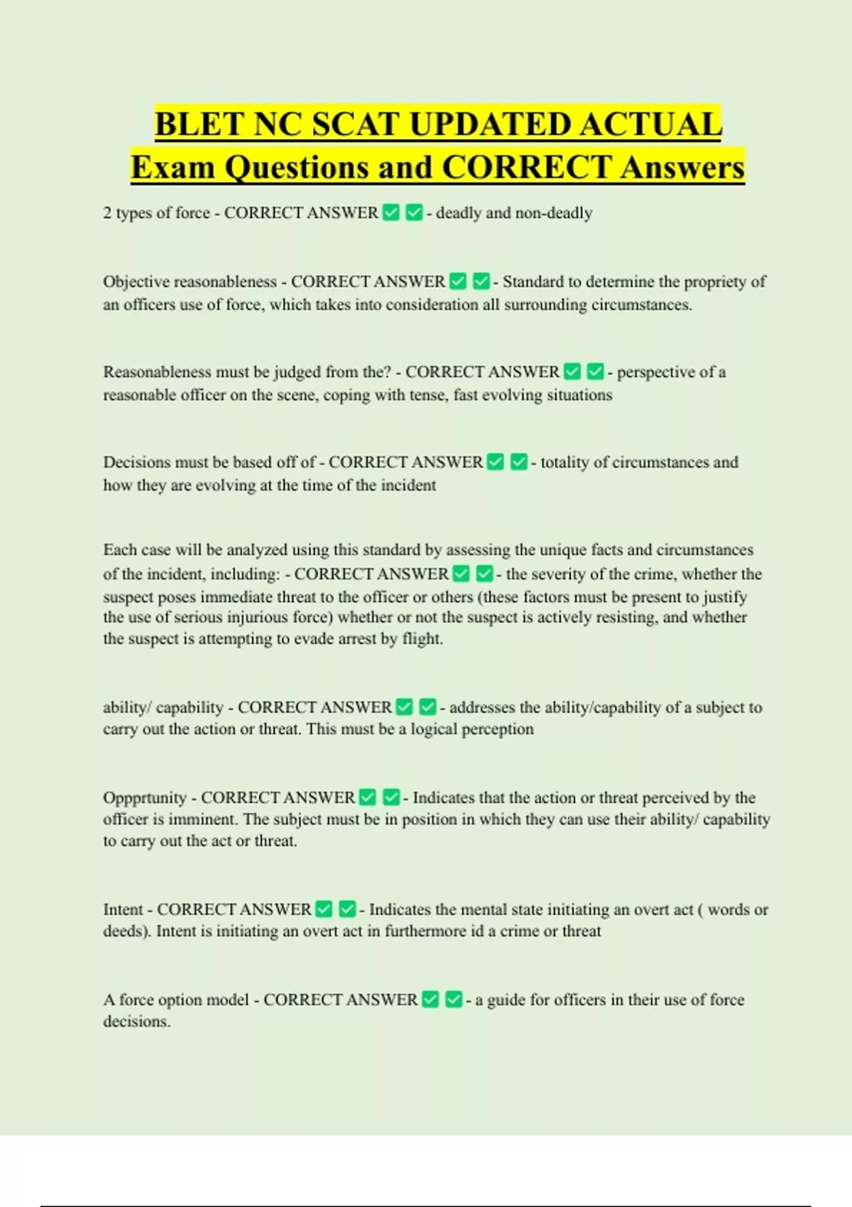 BLET NC SCAT UPDATED ACTUAL Exam Questions and CORRECT Answers 2 types of force - CORRECT ANSWER - deadly and non-deadly Objective reasonableness - CORRECT ANSWER - Standard to determine the propriety of an officers use of force, which takes into consideration all surrounding circumstances