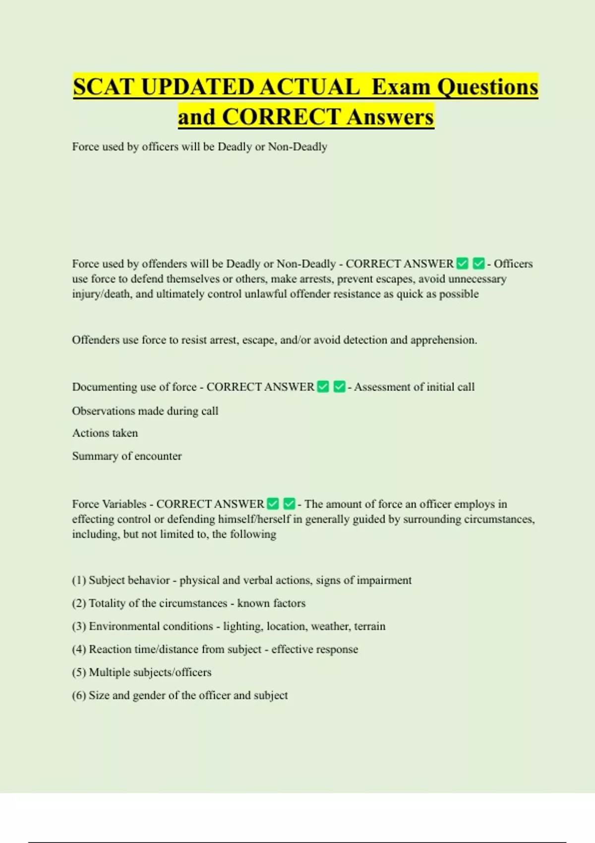 SCAT UPDATED ACTUAL Exam Questions and CORRECT Answers Force used by officers will be Deadly or Non-Deadly Force used by offenders will be Deadly or Non-Deadly - CORRECT ANSWER - Officers use force to defend themselves or others, make arrests, prevent escapes, avoid unnecessary injury/death, and ultimately control unlawful offender resistance as quick as possibl