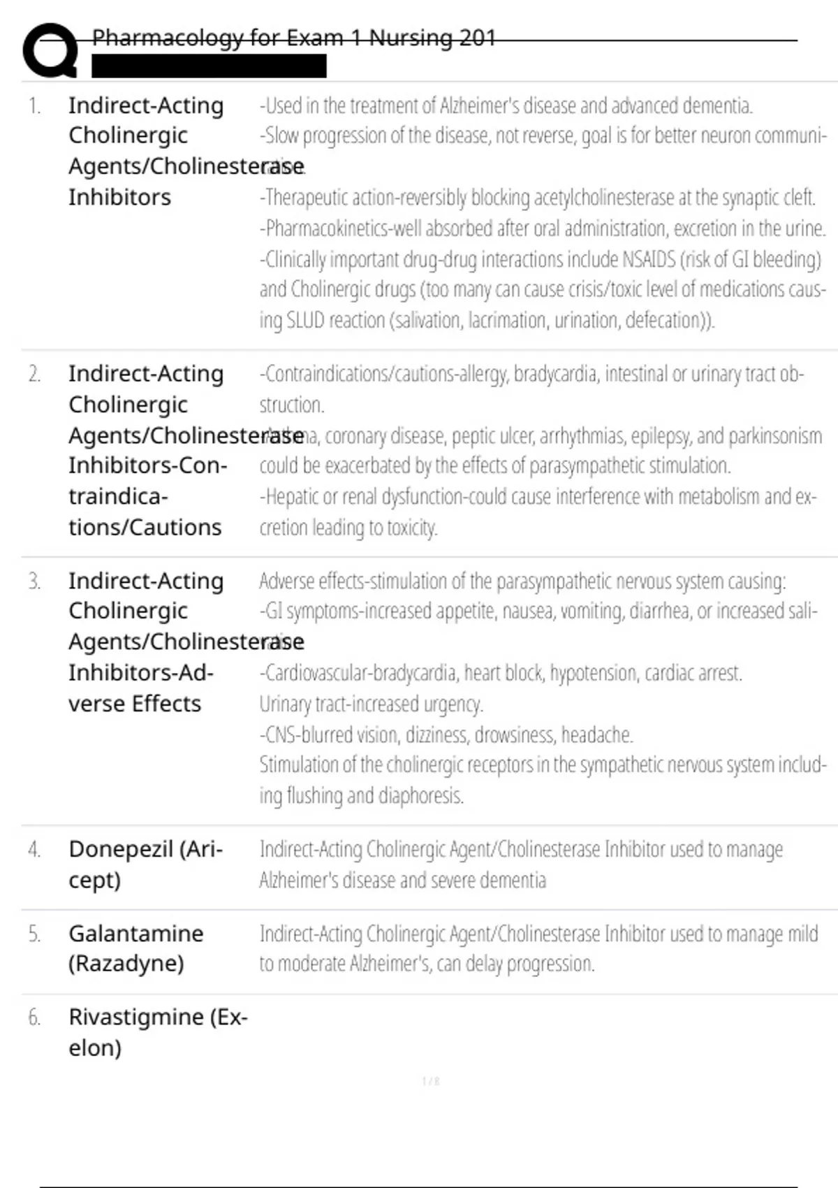 4. Donepezil (Ari- Indirect-Acting Cholinergic Agent/Cholinesterase Inhibitor used to manage