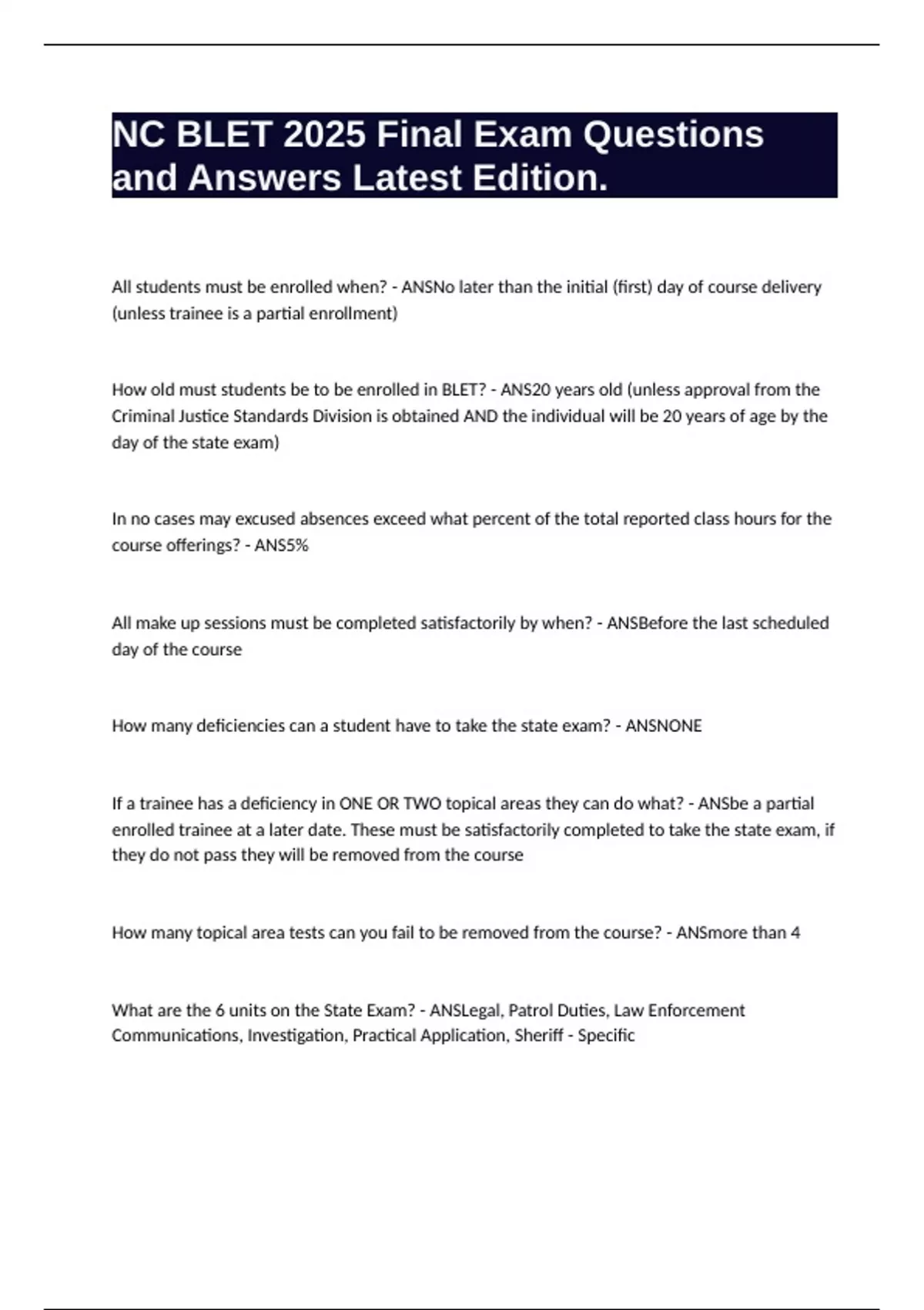 NC BLET 2025 Final Exam Questions and Correct Answers Latest Edition.