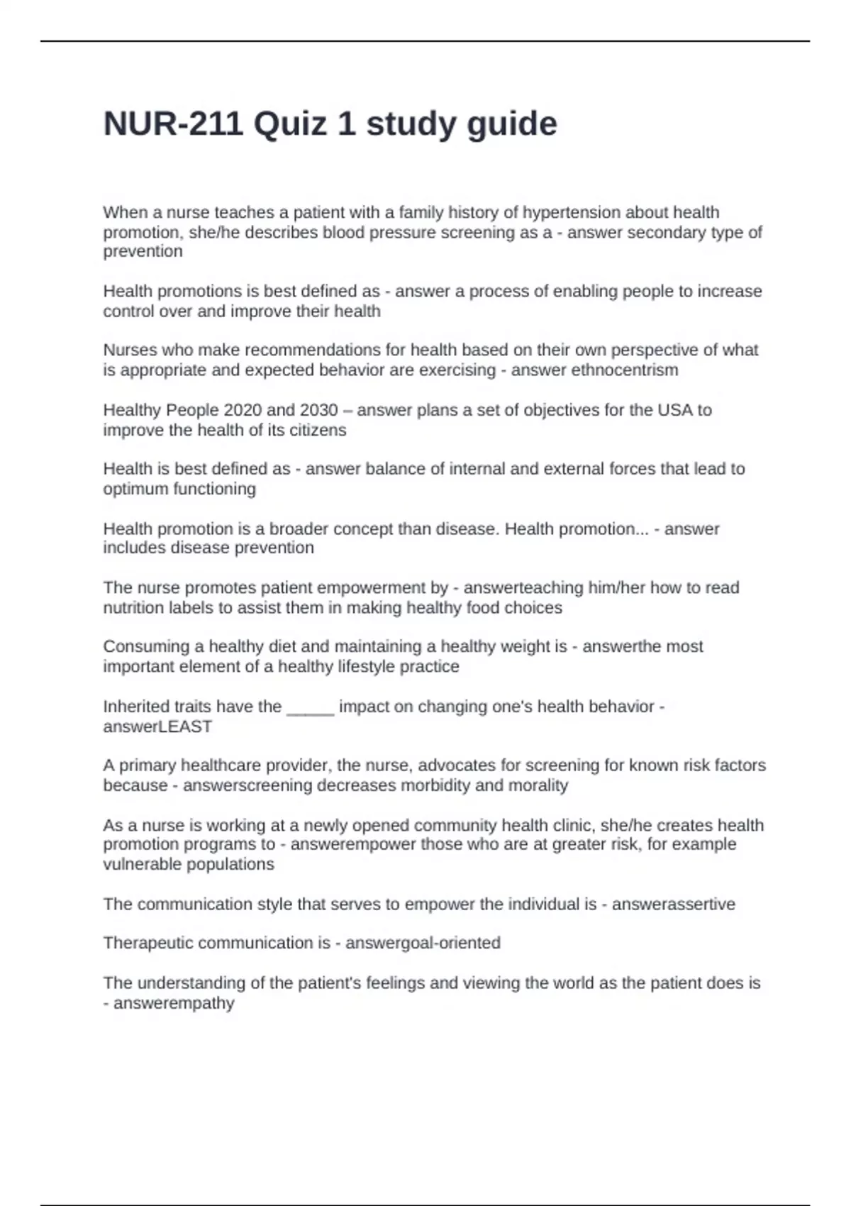 NUR-211 Quiz 1 study guide Questions and Answers 100% Solved