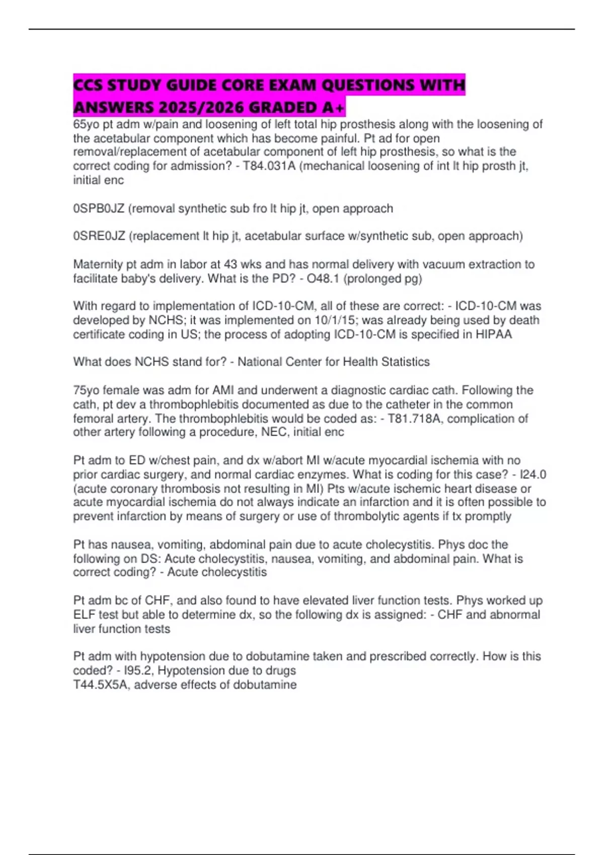 CCS STUDY GUIDE CORE EXAM QUESTIONS WITH ANSWERS 2025/2026 GRADED A+ 65yo pt adm w/pain and loosening of left total hip prosthesis along with the loosening of the acetabular component which has become painful. Pt ad for open removal/replacement of acetabular component of left hip prosthesis, so what is the correct coding for admission? - T84.031A (mechanical loosening of int lt hip prosth jt, initial enc 0SPB0JZ (removal synthetic sub fro lt hip jt, open approach 0SRE0JZ (replacement lt hip jt, acetabular surface w/synthetic sub, open approach) Maternity pt adm in labor at 43 wks and has normal delivery with vacuum extraction to facilitate baby's delivery. What is the PD? - O48.1 (prolonged pg) With regard to implementation of ICD-10-CM, all of these are correct: - ICD-10-CM was developed by NCHS; it was implemented on 10/1/15; was already being used by death certificate coding in US; the process of adopting ICD-10-CM is specified in HIPAA What does NCHS stand for? - National Center for Health Statistics