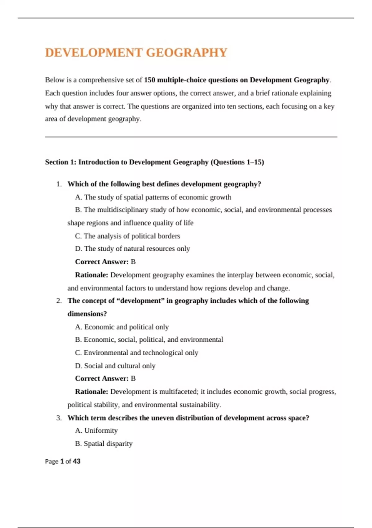 Section 1: Introduction to Development Geography (Questions 1–15)