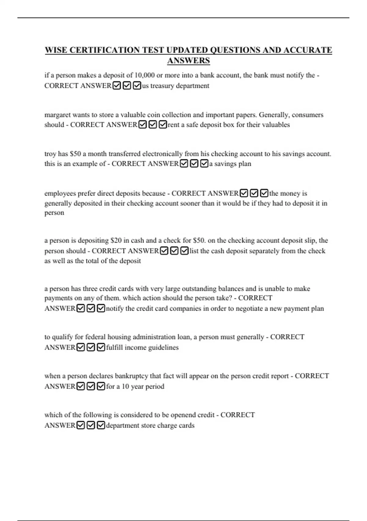 WISE CERTIFICATION TEST UPDATED QUESTIONS AND ACCURATE ANSWERS if a person makes a deposit of 10,000 or more into a bank account, the bank must notify the - CORRECT ANSWERus treasury department