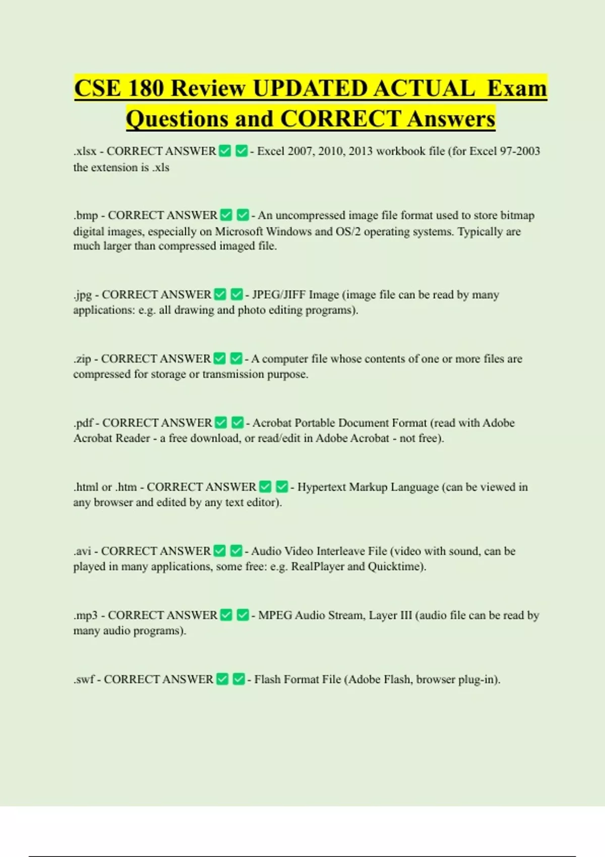 CSE 180 Review UPDATED ACTUAL Exam Questions and CORRECT Answers .xlsx - CORRECT ANSWER - Excel 2007, 2010, 2013 workbook file (for Excel 97-2003 the extension is .xls .bmp - CORRECT ANSWER - An uncompressed image file format used to store bitmap digital images, especially on Microsoft Windows and OS/2 operating systems. Typically are much larger than compressed imaged file