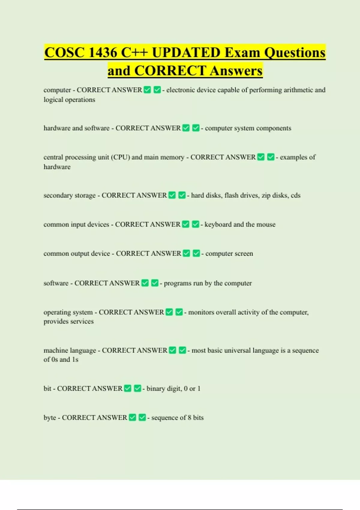 COSC 1436 C++ UPDATED Exam Questions and CORRECT Answers computer - CORRECT ANSWER - electronic device capable of performing arithmetic and logical operations hardware and software - CORRECT ANSWER - computer system components central processing unit (CPU) and main memory - CORRECT ANSWER - examples of hardware