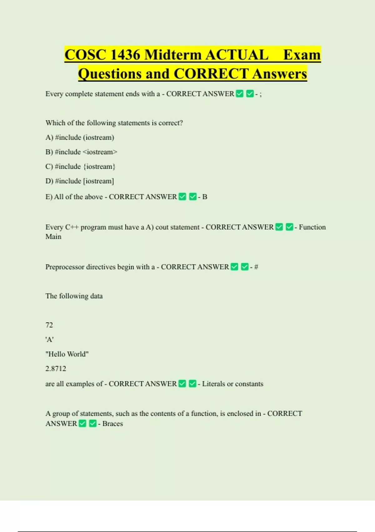 COSC 1436 Midterm ACTUAL Exam Questions and CORRECT Answers Every complete statement ends with a - CORRECT ANSWER - ; Which of the following statements is correct? A) #include (iostream) B) #include <iostream> C) #include {iostream} D) #include [iostream] E) All of the above - CORRECT ANSWER - B