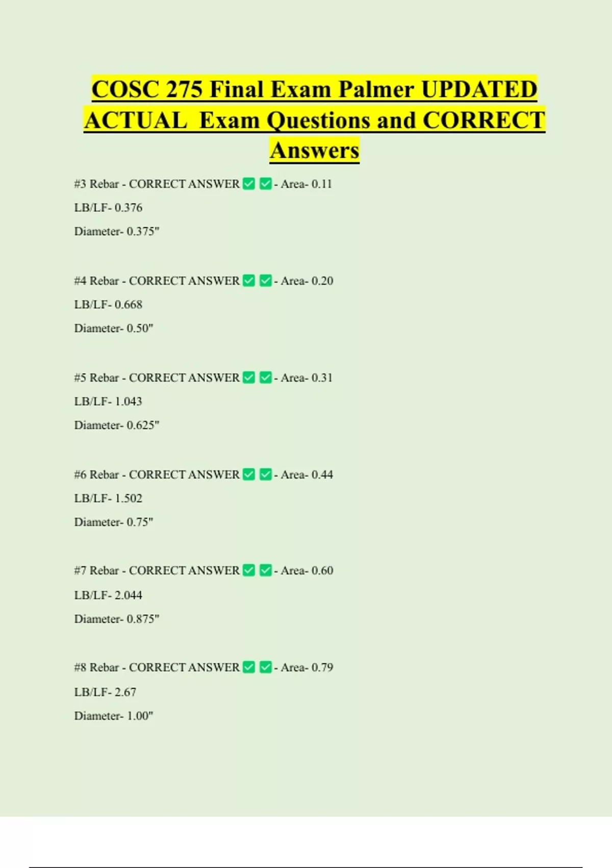 COSC 275 Final Exam Palmer UPDATED ACTUAL Exam Questions and CORRECT Answers #3 Rebar - CORRECT ANSWER - Area- 0.11 LB/LF- 0.376 Diameter- 0.375" #4 Rebar - CORRECT ANSWER - Area- 0.20