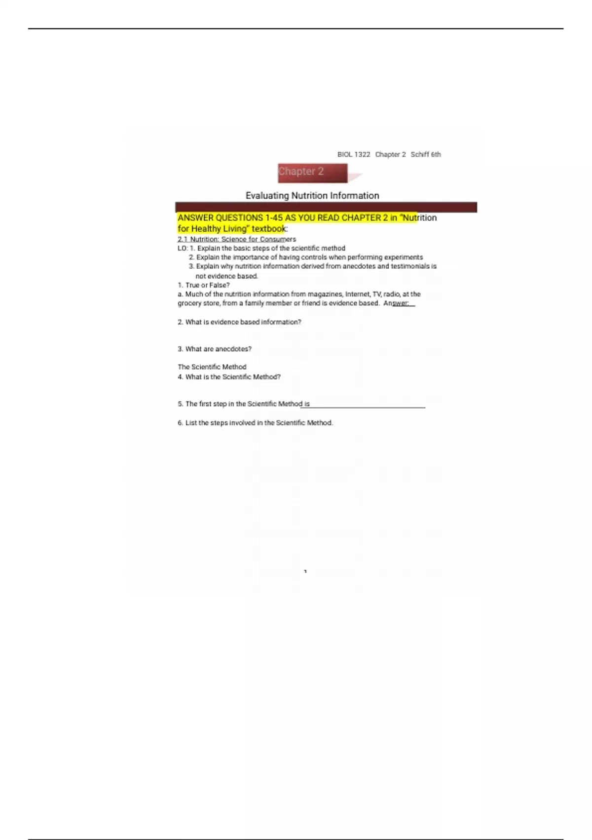 ANSWER QUESTIONS 1-45 AS YOU READ CHAPTER 2 in “Nutrition