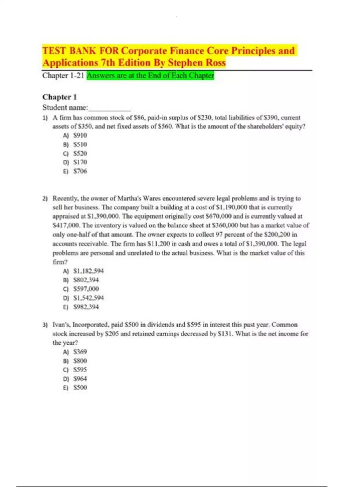 Test Bank for Corporate Finance Core Principles and Applications 7th Edition By Stephen Ross-A firm has common stock of $86, paid-in surplus of $230, total liabilities of $390, current assets of $350, and net fixed assets of $560. What is the amount of the shareholders' equity? A) $910 B) $510 C) $520 D) $170 E) $706 2) Recently, the owner of Martha's Wares encountered severe legal problems and is trying to sell her business. The company built a building at a cost of $1,190,000 that is currently appraised at $1,390,000. The equipment originally cost $670,000 and is currently valued at $417,000. The inventory is valued on the balance sheet at $360,000 but has a market value of only one-half of that amount. The owner expects to collect 97 percent of the $200,200 in accounts receivable. The firm has $11,200 in cash and owes a total of $1,390,000. The legal problems are personal and unrelated to the actual business. What is the market value of this firm? A) $1,182,594 B) $802,394 C) $597,000 D) $1,542,594 E) $982,394 3) Ivan's, Incorporated, paid $500 in dividends and $595 in interest this past year. Common stock increased by $205 and retained earnings decreased by $131. What is the net income for the year? A) $369 B) $800 C) $595 D) $964 E) $500 4) The tax rates for a particular year are shown below: Taxable Income Tax Rate $0 – 50,000 15% 50,001 – 75,000 25% 75,001 – 100,000 34% 100,001 – 335,000 39% What is the average tax rate for a firm with taxable income of $124,013? A) 39.00% B) 36.39% C) 20.00% D) 27.98% E) 25.49% 5) The tax rates are as shown below: Taxable Income Tax Rate $0 – 50,000 15% 50,001 – 75,000 25% 75,001 – 100,000 34% 100,001 – 335,000 39% Your firm currently has taxable income of $81,700. How much additional tax will you owe if you increase your taxable income by $22,900? A) $7,626 B) $8,016 C) $8,931 D) $7,636 E) $7,786 6) Your firm has net income of $371 on total sales of $1,460. Costs are $800 and depreciation is $130. The tax rate is 30 percent. The firm does not have interest expenses. What is the operating cash flow? A) $501 B) $660 C) $901 D) $530 E) $371 7) Teddy's Pillows had beginning net fixed assets of $477 and ending net fixed assets of $562. Assets valued at $325 were sold during the year. Depreciation was $54. What is the amount of net capital spending? A) $464 B) $139 C) $85 D) $31 E) $291 8) At the beginning of the year, a firm has current assets of $332 and current liabilities of $236. At the end of the year, the current assets are $501 and the current liabilities are $276. What is the change in net working capital? A) $209 B) $0 C) −$129 D) $129 E) $169 9) At the beginning of the year, long-term debt of a firm is $278 and total debt is $324. At the end of the year, long-term debt is $254 and total debt is $334. The interest paid is $20. What is the amount of the cash flow to creditors? A) −$44 B) $24 C) $44 D) −$24 E) $20 10) Peggy Grey's Cookies has net income of $400. The firm pays out 30 percent of the net income to its shareholders as dividends. During the year, the company sold $85 worth of common stock. What is the cash flow to stockholders? A) $205.00 B) $35.00 C) $280.00 D) $94.50 E) $120.00 11) A company has total equity of $1,905, net working capital of $155, long-term debt of $900, and current liabilities of $930. What is the company's net fixed assets? A) $1,085 B) $2,805 C) $2,650 D) $1,935 E) $3,735 12) Disturbed, Incorporated, had the following operating results for the past year: sales = $22,569; depreciation = $1,370; interest expense = $1,104; costs = $16,520. The tax rate for the year was 30 percent. What was the company's operating cash flow? A) $7,122 B) $3,575 C) $4,977 D) $2,774 E) $2,503