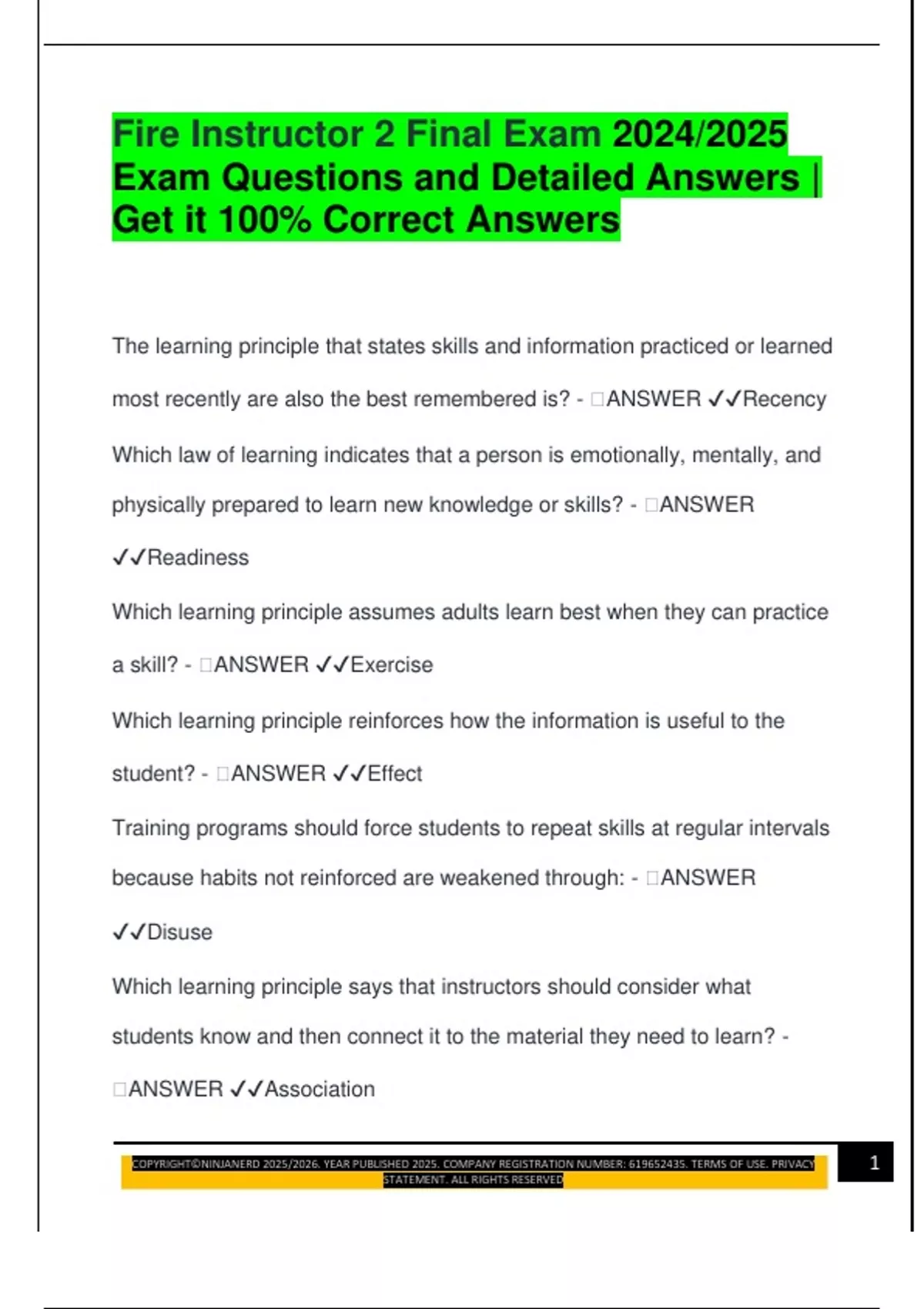 Fire Instructor 2 Final Exam 2024/2025 Exam Questions and Detailed Answers | Get it 100% Correct Answers The learning principle that states skills and information practiced or learned most recently are also the best remembered is? -